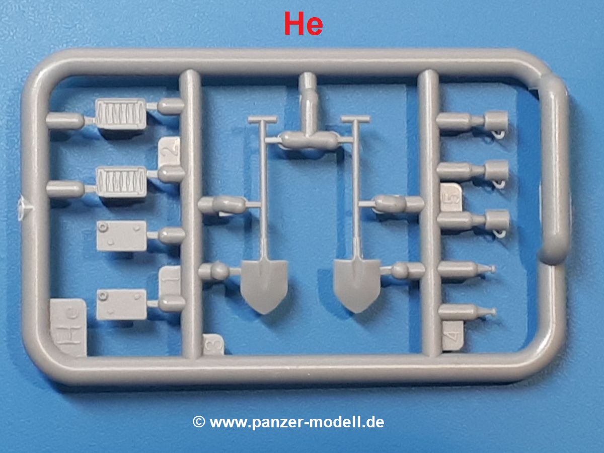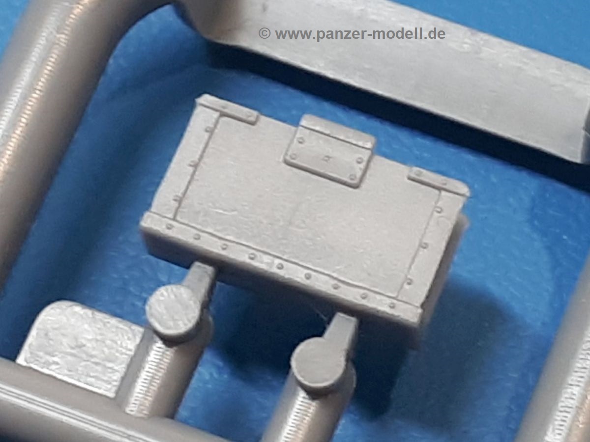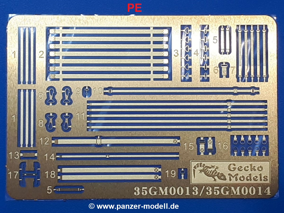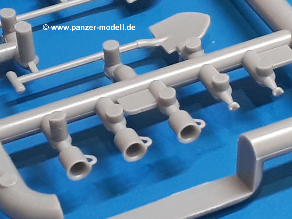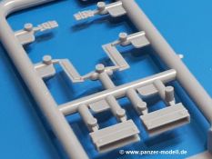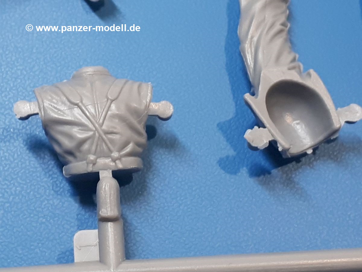 Die Teile sind sauber gespritzt, ohne Versatz und dicken Grat. Nur hier und da feiner Grat. Gesichter und Faltenwurf der Uniformen sind akzeptabel und für Spritzguss toll geworden. Viele Ausrüstungsgegenstände sind zur besseren Detaillierung mehrteilig ausgeführt, einige Details wie die Läufe der Waffen sind sehr filigran.Das Team besteht aus 5 Soldaten. Sie tragen Uniformen, wie sie im 2. Weltkrieg in Nord-Europa zum Einsatz kamen. Wer mitgezählt hat, konnte feststellen, dass es wesentlich mehr Arme als Soldaten gibt. Nein, das ist keine Spezialeinheit bestehend aus indischen Göttern, sondern Gecko Models ermöglicht für 4 der 5 Figuren je 2 Optionen.Dem Bausatz geschuldet ist der Mittelpunkt das Vickers-MG Kal. 0.303, das mit 2 verschiedenen Läufen gebaut werden kann. Die Laufmündungen sind natürlich bereits ausgehöhlt. Verschlussgehäuse, Handgriffe und Direktvisier sind separat vorhanden. Das dazugehörige, ausgeklappte Dreibein nimmt das MG-Lager mit Höhenstelleinrichtung auf und besteht aus insgesamt 6 Teilen. Ein Wasserkanister für die Kühlung, ein Gurtkasten und Munitionsgurt vervollständigen das Vickers. Anders als bei dem MG-Team im Einsatz werden die Teile auf die Soldaten aufgeteilt.Wer ist denn nun wer? Durch die vielen Optionen wird das nicht mehr so eindeutig. Beschreiben wir die Soldaten mal anhand der Spritzling-Nummern.Spritzling A: Option 1 stellt den, das ausgeklappte Dreibein auf den Schultern tragenden Soldaten dar. Seine Arme sind dabei lässig über die Beine des Gestells gelegt. Die Ärmel der Jacke sind hochgekrempelt. Auf dem Kopf trägt er den typischen Brodie-Helm (im deutschen auch Tellerhelm genannt). Vorn trägt er 2 große Magazintaschen, an der rechten Seite eine Feldflasche, an der linken 1 Ausrüstungstasche und hinten eine Tasche mit Grabwerkzeug. In der Option 2 trägt er das Bren-MG mit eingeklapptem Zweibein auf der linken Schulter, den Arm über den Lauf gelegt. Mit der rechten Hand hält er sich an einer Magazintasche fest. Helm und Ausrüstung wie in Option 1.Spritzling B: Auch hier gibt es 2 Optionen, aber in der Anleitung ist wohl etwas nicht ganz richtig, so dass ich bei der 2. Version etwas raten muss. Auf alle Fälle ist er derjenige, der das Vickers-MG trägt. Das MG liegt auf der rechten Schulter auf, die rechte Hand hält es am Bediengriff. Mit der linken Hand trägt er einen MG-Kasten. Seine Ausrüstung besteht natürlich aus dem Helm, dazu eine Feldflasche an der rechten Seite, 2 kleine Ausrüstungstaschen vorn am Koppel, eine große an der linken Seite. Dort finden wir auch einen Spaten, dessen Blatt an der linken Brust anliegt und der Stiel nach hinten links herausschaut. Auf dem Rücken trägt er einen Rucksack. Die 2. Option ist bis auf den rechten Arm gleich. Der rechte Arm hängt mit geöffneter Hand herunter. Ich rate mal, dass man ihm einen weiteren Gurtkasten oder einen Karabiner in die Hand geben könnte.Spritzling C: Der Munitionsträger ist der einzige ohne weitere Option. Er trägt in beiden Händen Munitionskästen und auf dem Rücken einen Munitionsrucksack. Vorn trägt er 2 große Magazintaschen, an der rechten Seite eine Feldflasche, an der linken 1 Ausrüstungstasche und hinten eine Tasche mit Grabwerkzeug. Selbstverständlich trägt auch er einen Brodie-Helm.Spritzling D: Ich möchte ihn mal den Sicherungsschützen nennen, denn er trägt entweder ein Bren-MG mit beiden Händen einsatzbereit vor dem Körper oder einen Karabiner in der rechten Hand. Seine Ausrüstung besteht in beiden Optionen aus Helm auf dem Kopf, Feldflasche an der rechten Seite, 2 großen Magazintaschen vorn, eine große Ausrüstungstasche an der linken Seite und einem Rucksack auf dem Rücken.Spritzling E: Hier haben wir, zumindest in der Version mit der Sten-MP, den Truppführer vor uns. Mit der rechten Hand hält er sich an einer Magazintasche fest, in der linken trägt er den Wasserkanister für die MG-Kühlung. Seine Ausrüstungsgegenstände sind Helm, 2 große Magazintaschen vorn, eine große Ausrüstungstasche an der linken Seite, ein Rucksack auf dem Rücken und die Tasche mit Grabwerkzeug. Vorn schräg über die Hüfte trägt er noch einen Gurt mehren Taschen. Alternativ trägt er dann als Truppführer die Sten-MP an der rechten Seite oder als Beobachter das Entfernungsmessgerät in seiner Schutztasche.Für die Stahlhelme, Taschen und Waffen gibt es Gurte aus PE-Material. Auch die Tragegriffe für den MG-Kasten und die Wasserkanister sind aus PE.Der Decalbogen hat Rangabzeichen vom Korporal bis zum Sergeanten anzubieten. Dazu kommen Beschriftungen für die Wasserkanister und Munitionskisten, MG-Schützenabzeichen und Einheitsabzeichen. Unter den Einheiten sind eindeutig zu erkennen die 11th Armoured Division (schwarzer Bulle in gelbem Feld), die 49th Infantry Brigade (Polarbär in schwarzem Feld) und die 53rd (Welsh) Infantry Division (rote Krone in braunem Feld).Die teils farbige Bauanleitung zeigt die gebauten Figuren mit den Nummern, wohin die Teile gehören. Die Bemalungshinweise sind pro Figur mittels Farbnamen angegeben. Anhand eines aufrecht gehenden Soldaten wird die Anbringung der Rang- und Einheitsabzeichen gezeigt. Der Zusammenbau von Munitionskisten, Wasserkanistern, Vickers-MG, Entfernungsmesser und Waffen erscheint in Extra-Bauschritten. Dies gilt auch für die Anbringung der PE-Gurte. Ein weiterer Schritt ist der Anbringung der Decals an Wasserkanistern und Munitionskisten gewidmet. Dort findet man auch die Farbangaben dazu, ebenso wie die Bemalung der Schaufel und der Tassen. Der letzte Schritt zeigt die Anbringung der PE-Gurte an Helm, Tasche und Fernglas-Etui sowie deren Bemalung.Nach dem MG-Team in Aktion ist dieser Satz auch hochwillkommen. Das Team befindet sich im aufrechten Gang beim Marsch fernab vom Feind. Aufgrund der vielen Figurenoptionen ist man mit 2-3 dieser Bausätze sicher gut bedient. Der Preis um die 16 EUR macht diese Figuren sicher noch attraktiver. Fans der britischen Armee ran an den S