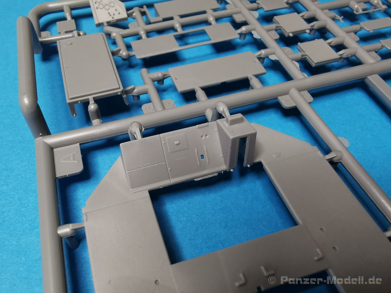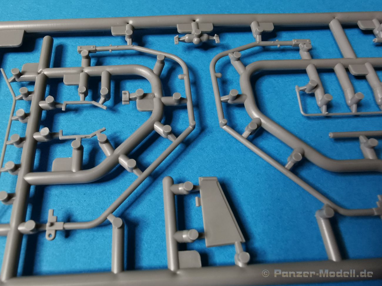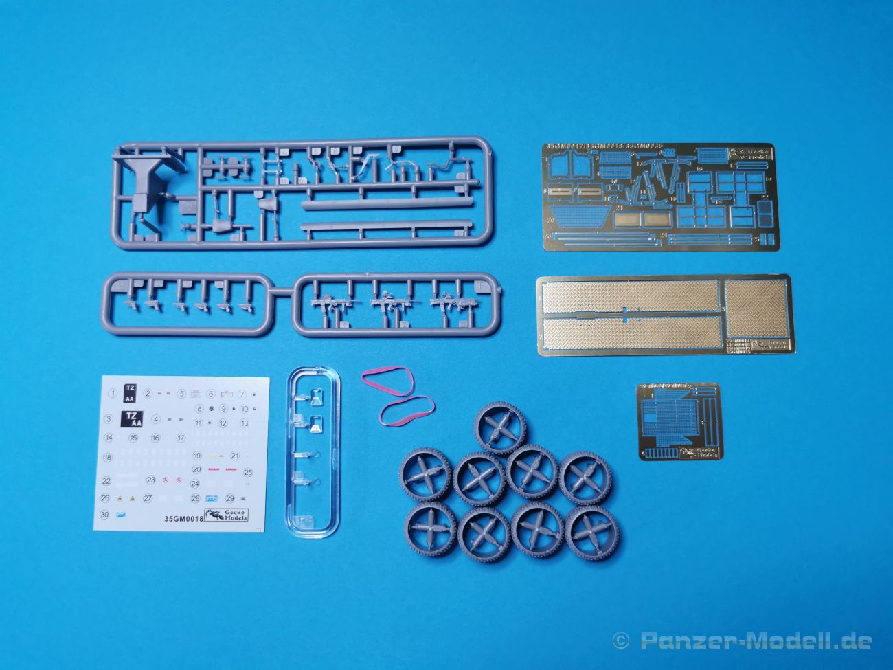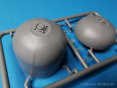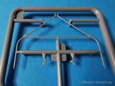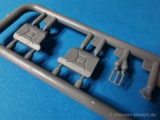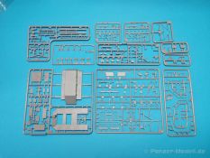 Ich war zunächst erstaunt über die hohe Anzahl der Spritzrahmen aus hellgrauem Plastik. So viele Bauteile für so ein kleines Fahrzeug mit einem kleinen Anhänger... Nämlich insgesamt 34 Spritzrahmen, dazu kommen Klarsichtteile für Spiegel und Scheinwerfer, 3 Platinen mit PE Teilen, 9 Reifen aus Spritzguss, 2 Gummibänder und ein Decal-Sheet. Der Karton ist also reichlich gefüllt. Der Bausatz bietet eine sehr gute Fertigungsqualität, scharfkantiger Guss, sehr schöne und sehr fein detaillierte Bauteile, einiges an Zubehör und sogar eine Fahrerfigur sind enthalten. Der Bausatz bietet eine sehr gute Fertigungsqualität, scharfkantiger Guss, sehr schöne und sehr fein detaillierte Bauteile, einiges an Zubehör und sogar eine Fahrerfigur sind enthalten. Jedoch weisen einige Bauteile auch Gusshäute auf. Die dürften sich relativ leicht entfernen lassen. Für die Figur liegen zwei alternative Köpfe bei. Einmal der Kopf mit Schutzbrille, einmal ohne Brille. Bei der Figur sticht besonders positiv der Faltenwurf der Kleidung hervor. Für den Fahrer- und Beifahrersitz sind photogeätzte Hosenträgergurte enthalten. Weiterhin befinden sich drei L85 Sturmgewehre im Bausatz. Für die Gewehre gibt es sogar photogeätzte Trageriemen. Darüber hinaus sind auch Pistolen im Bausatz vorhanden. Jeweils die Glock 17 und die SIG Sauer 226, beide optional mit und ohne Holster. Besonders gut gefallen mir die Räder in diesem Bausatz. Sie bestehen nämlich aus Spritzguss und nicht, wie bei vielen anderen Herstellern, aus Gummi. Das hat den Vorteil, dass sie sich zum einen besser bemalen lassen und zum anderen kann sich hier kein Weichmacher verflüchtigen. Das führt nämlich dazu, dass die Gummireifen im Laufe der Zeit spröde werden und sich Risse im Material bilden können. In diesem Bausatz besteht ein Reifen aus 6 Bauteilen die einen ganz hervorragenden Eindruck machen. Eine Beschriftung der Reifenflanken ist selbstverständlich ebenfalls vorhanden. Die Bauanleitung: Sie führt im Format DIN A4 quer in insgesamt 18 Baustufen zum fertigen Modell. Die Zeichnungen sind groß und sehr übersichtlich gehalten. Da dürften keine Schwierigkeiten auftreten. Das Decalsheet bietet die Beschriftungen und Markierungen für das Zugfahrzeug, den Kran und den Anhänger sowie Abzeichen für den Kampfanzug des Fahrers. Die amtlichen Kennzeichen sind ohne Ziffern gedruckt, nur die Buchstaben sind bereits vorgedruckt. Hier kann man sich entweder sein „Wunschkennzeichen“ anfertigen oder ein Kennzeichen nach Vorbildfotos gestalten. Die entsprechenden Ziffern sind bei den Decals separat vorhanden. Für die Bemalung bietet die Anleitung je ein Fahrzeug in Natogrün oder hellem Sandton. Beide sind jeweils in einer Fünf-Seiten-Ansicht dargestellt. Besonders das sandfarbene Fahrzeug fällt durch den knallroten Kran ins Auge. Der dürfte wohl extern beschafft worden sein und setzt, mit der zivilen Farbgebung, ein echtes Highlight. Der rote Kran ist übrigens durch Referenzfotos belegbar. Fazit: Für rund 33 EUR erhält man hier ein sehr schönes Modell mit tollen Details. Auf einem kleinen Diorama dürfte der ATMP mit dem Anhänger ein echter Hingucker werden.