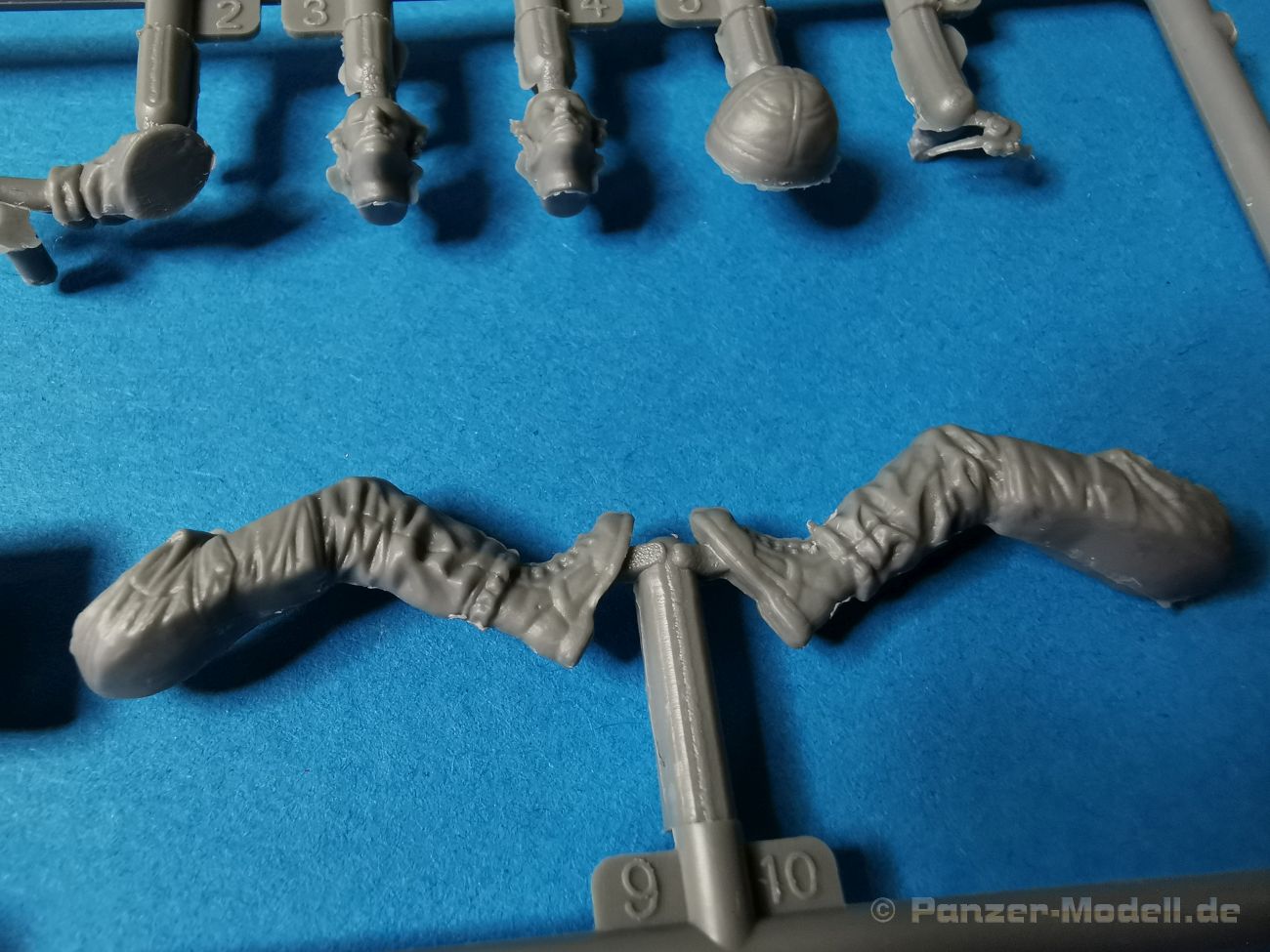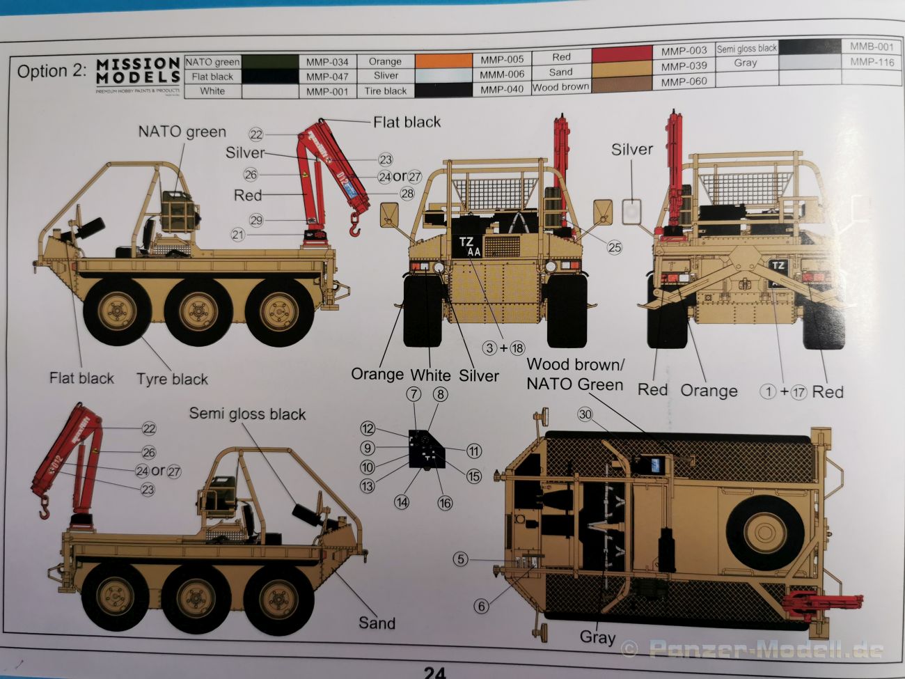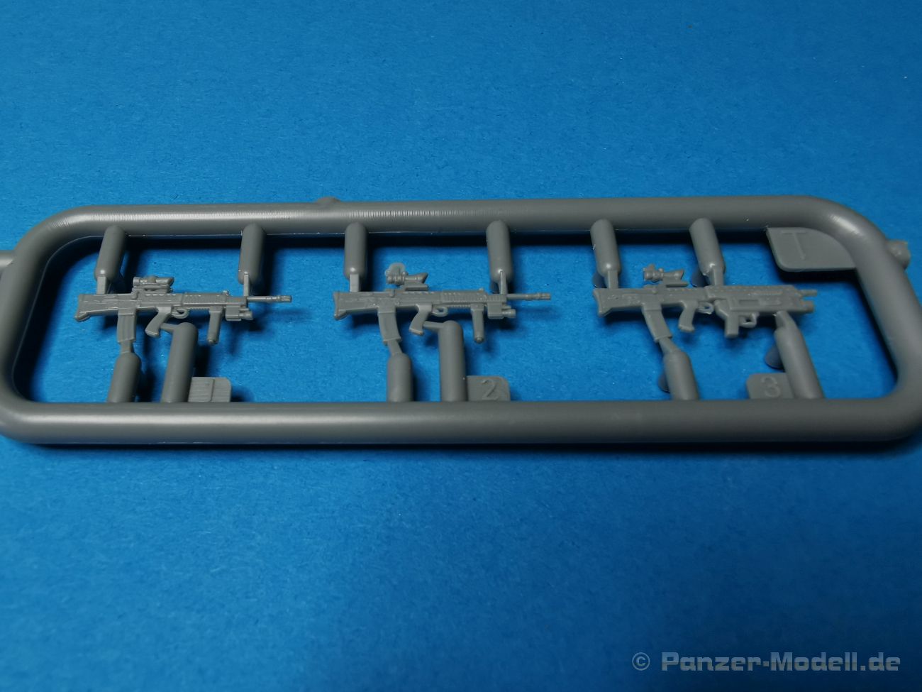 Ich war zunächst erstaunt über die hohe Anzahl der Spritzrahmen aus hellgrauem Plastik. So viele Bauteile für so ein kleines Fahrzeug mit einem kleinen Anhänger... Nämlich insgesamt 34 Spritzrahmen, dazu kommen Klarsichtteile für Spiegel und Scheinwerfer, 3 Platinen mit PE Teilen, 9 Reifen aus Spritzguss, 2 Gummibänder und ein Decal-Sheet. Der Karton ist also reichlich gefüllt. Der Bausatz bietet eine sehr gute Fertigungsqualität, scharfkantiger Guss, sehr schöne und sehr fein detaillierte Bauteile, einiges an Zubehör und sogar eine Fahrerfigur sind enthalten. Der Bausatz bietet eine sehr gute Fertigungsqualität, scharfkantiger Guss, sehr schöne und sehr fein detaillierte Bauteile, einiges an Zubehör und sogar eine Fahrerfigur sind enthalten. Jedoch weisen einige Bauteile auch Gusshäute auf. Die dürften sich relativ leicht entfernen lassen. Für die Figur liegen zwei alternative Köpfe bei. Einmal der Kopf mit Schutzbrille, einmal ohne Brille. Bei der Figur sticht besonders positiv der Faltenwurf der Kleidung hervor. Für den Fahrer- und Beifahrersitz sind photogeätzte Hosenträgergurte enthalten. Weiterhin befinden sich drei L85 Sturmgewehre im Bausatz. Für die Gewehre gibt es sogar photogeätzte Trageriemen. Darüber hinaus sind auch Pistolen im Bausatz vorhanden. Jeweils die Glock 17 und die SIG Sauer 226, beide optional mit und ohne Holster. Besonders gut gefallen mir die Räder in diesem Bausatz. Sie bestehen nämlich aus Spritzguss und nicht, wie bei vielen anderen Herstellern, aus Gummi. Das hat den Vorteil, dass sie sich zum einen besser bemalen lassen und zum anderen kann sich hier kein Weichmacher verflüchtigen. Das führt nämlich dazu, dass die Gummireifen im Laufe der Zeit spröde werden und sich Risse im Material bilden können. In diesem Bausatz besteht ein Reifen aus 6 Bauteilen die einen ganz hervorragenden Eindruck machen. Eine Beschriftung der Reifenflanken ist selbstverständlich ebenfalls vorhanden. Die Bauanleitung: Sie führt im Format DIN A4 quer in insgesamt 18 Baustufen zum fertigen Modell. Die Zeichnungen sind groß und sehr übersichtlich gehalten. Da dürften keine Schwierigkeiten auftreten. Das Decalsheet bietet die Beschriftungen und Markierungen für das Zugfahrzeug, den Kran und den Anhänger sowie Abzeichen für den Kampfanzug des Fahrers. Die amtlichen Kennzeichen sind ohne Ziffern gedruckt, nur die Buchstaben sind bereits vorgedruckt. Hier kann man sich entweder sein „Wunschkennzeichen“ anfertigen oder ein Kennzeichen nach Vorbildfotos gestalten. Die entsprechenden Ziffern sind bei den Decals separat vorhanden. Für die Bemalung bietet die Anleitung je ein Fahrzeug in Natogrün oder hellem Sandton. Beide sind jeweils in einer Fünf-Seiten-Ansicht dargestellt. Besonders das sandfarbene Fahrzeug fällt durch den knallroten Kran ins Auge. Der dürfte wohl extern beschafft worden sein und setzt, mit der zivilen Farbgebung, ein echtes Highlight. Der rote Kran ist übrigens durch Referenzfotos belegbar. Fazit: Für rund 33 EUR erhält man hier ein sehr schönes Modell mit tollen Details. Auf einem kleinen Diorama dürfte der ATMP mit dem Anhänger ein echter Hingucker werden.