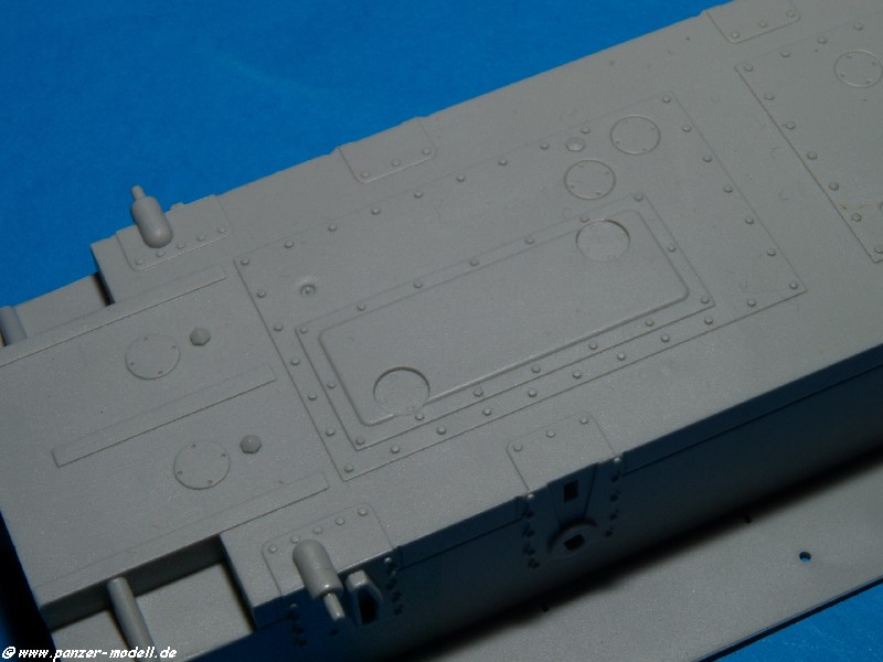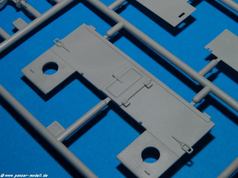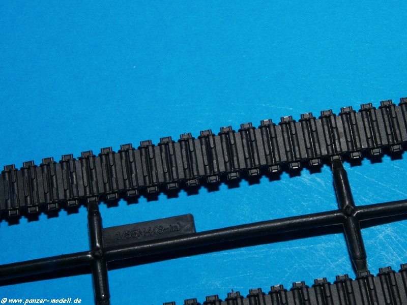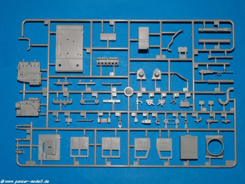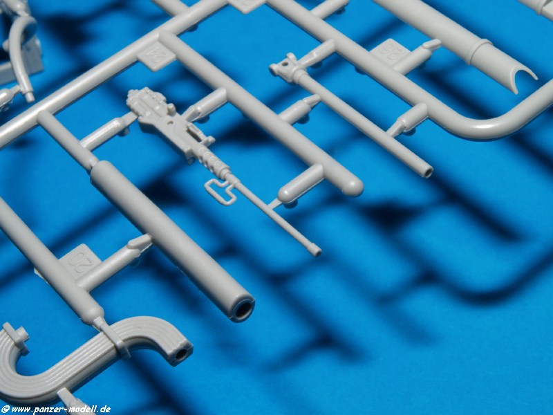 Die Qualität der einzelnen Teile ist gut, hier und da gibt es allerdings Sinkstellen. Diese befinden sich aber an Stellen, die nach dem Bau nicht mehr sichtbar sind. Bei der Detailierung hat Hobby Boss ganze Arbeit geleistet. Die einzelnen Teile sind schön gestaltet worden. Beim beigelegten cal.50 MG wurde sogar das Rohr an der Mündung aufgebohrt. Der Innenraum des M4 ist ebenfalls schön wiedergegeben. Ferner besteht die Möglichkeit, das Fahrzeug mit geschlossenen oder offenen Türen zu bauen. So ergeben sich sehr viele Gestaltungsmöglichkeiten. Highlight des Bausatzes ist meiner Meinung nach der Motor. Da die Abdeckungen als geätzte Gitter beiliegen, hat man einen freien Blick auf den Motorraum. Hier hat Hobby Boss nicht gespart und dem Bausatz einen schönen Motorblock samt Anbeiteilen wie den Lüfter spendiert.
