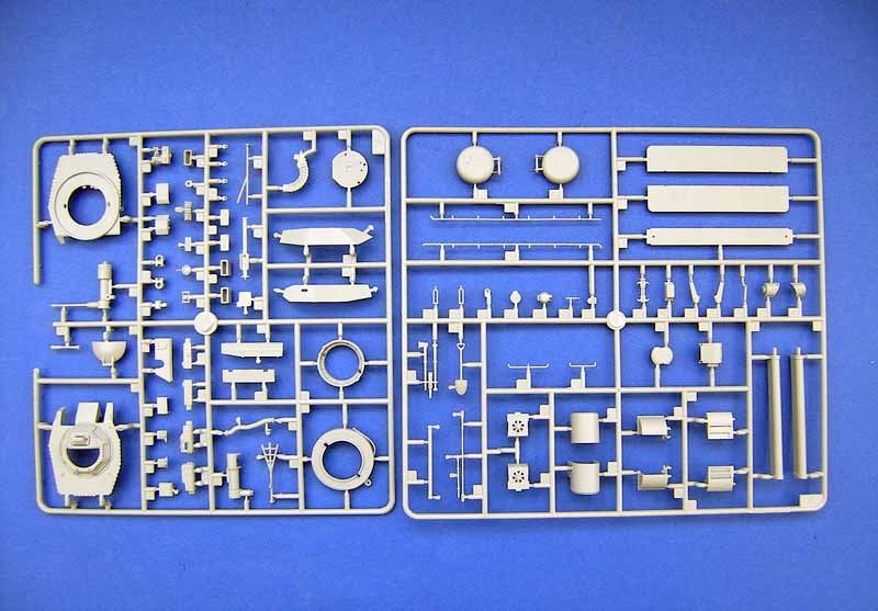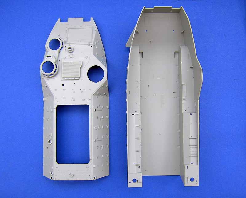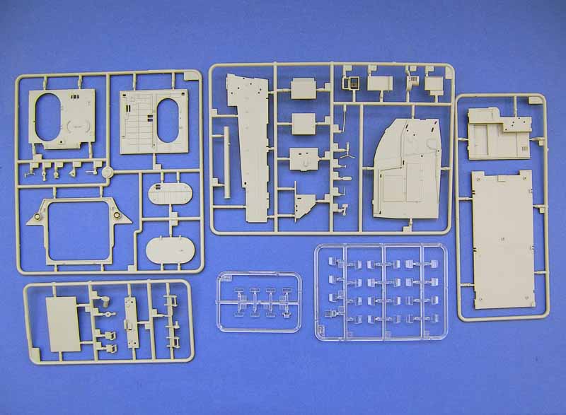 Der Hersteller hat sehr gute Arbeit geleistet und viele kleine Features verwirklicht die zu einem Spritzgussbausatz in der heutigen Zeit einfach dazugehören. So findet sich z. B. partiell eine leicht rauhe Oberfläche auf dem Wannenoberteil die den Antirutschbelag darstellen soll. Der aufgebrachte Belag sieht sehr realistisch aus. Die optische Wirkung wird sich tatsächlich erst nach der Bemalung sagen lassen. Ich denke aber dass der Belag sehr gut wiedergegeben wurde. Weiterhin sind die Rohrmündungen der Bewaffnung leicht aufgebohrt, die Luken der Besatzung und die Kampfraumluken lassen sich öffnen, sind auf der Innenseite detailliert und weisen keine sichtbaren Auswerferstellen auf. Darüber hinaus enthält das Modell eine komplette Inneneinrichtung die einem Blick durch sämtliche geöffneten Luken standhalten dürfte. Klarsichtteile für die Winkelspiegel sind ebenfalls vorhanden.