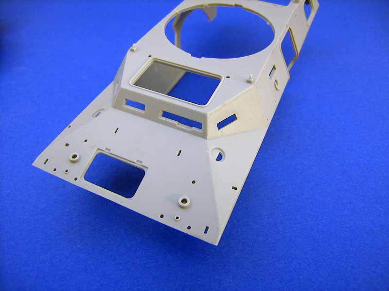 Die Qualität der einzelnen Bauteile habe ich bereits beim V-150 erwähnt, daher spare ich mir die Ausführungen darüber. Die 90 mm Kanone ist als ein Bauteil ausgeführt inklusive bereits angesetzter Rohrmündung. Das erleichtert den Bau ganz erheblich. Bestünde die Kanone aus zwei Rohrhälften, die mit einander verklebt werden müssten, dürfte erhebliche Spachtel- und Schleifarbeit anfallen. So muss lediglich ein ganz leichter Gussgrat mittels feinem Schleifpapier bearbeitet werden.