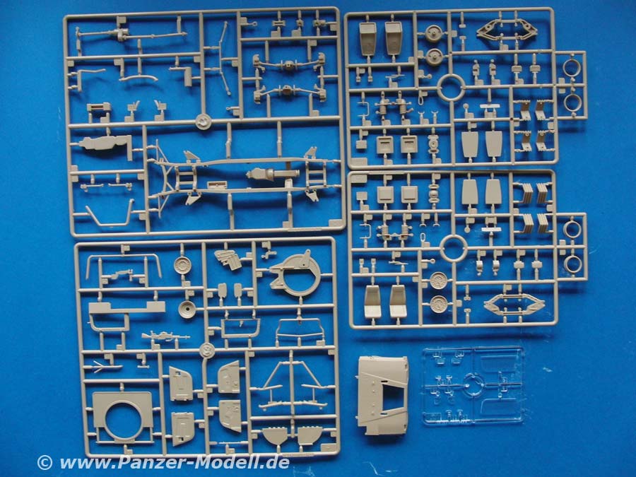 Der Kartoninhalt besteht aus 5 Spritzlingen, Klarsichtteile, Motorhaube, Seitenteile, Unterwanne, PE Teile, Vinylreifen und ein Decalbogen.