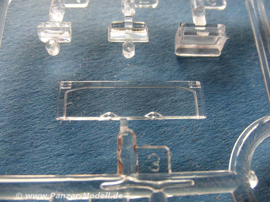 Die Fahrerluke kann vorbildgerecht in zwei Erhöhungen gebaut werden - einmal mit den Winkelspiegeln und eine Sichtstufe höher mit der großflächigen Glasfront. Letztere ist exzellent in klarem Plastik dargestellt.