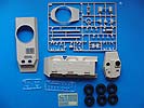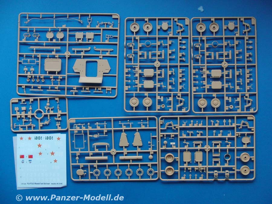 Der Kartoninhalt besteht aus 7 Spritzlingen, 2 Klarsichtspritzlinge Unterwanne, Oberwanne, Turm, 6 Vinylreifen, PE Teile und ein Decalbogen.