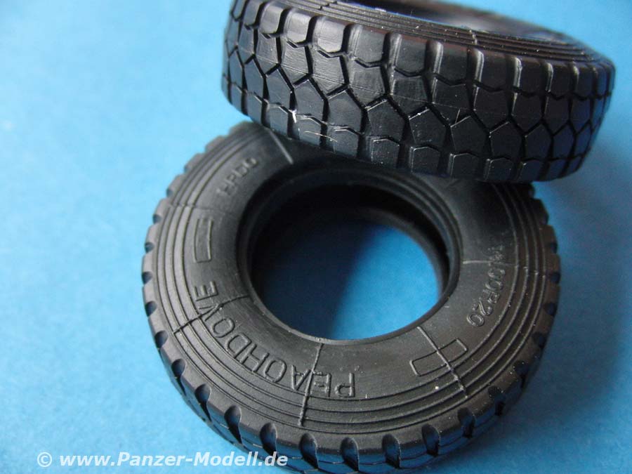 Soweit aus den Teilen und Anleitung erkennbar, lassen sich die Räder auch mit Lenkeinschlag darstellen. Die Reifen aus Vinyl sind gut gemacht, mit schönem Profil und feinem Herstelleraufdruck an den Reifenflanken.