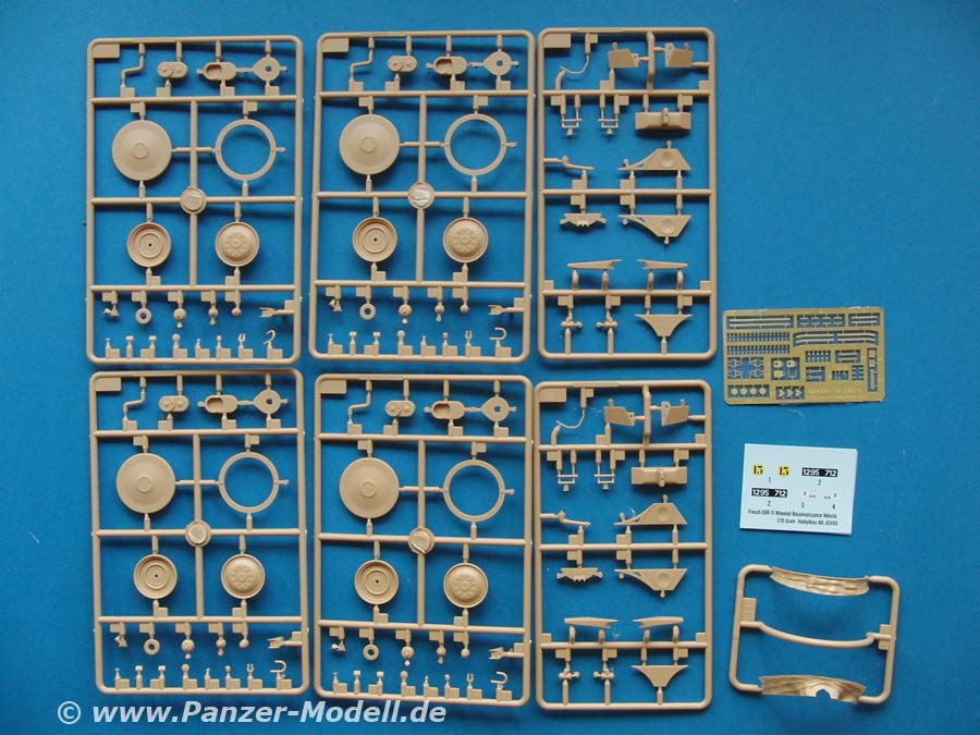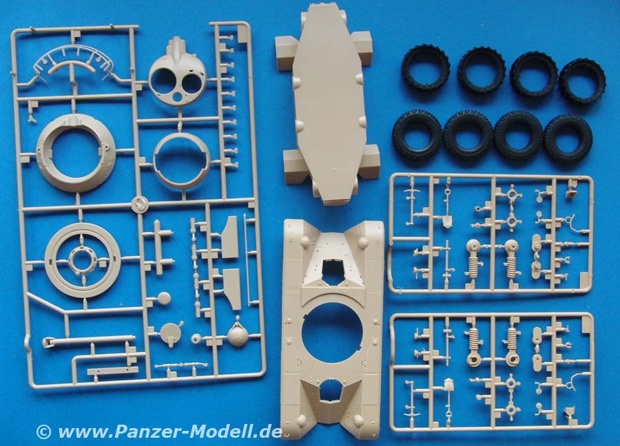 Der Kartoninhalt besteht aus 10 Spritzlingen, Ober- und Unterwanne, Vinylreifen, PE Teile und ein Decalbogen.