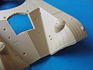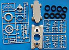 Unter- und Oberwanne sind bereits als große Teile in einem Stück gegossen, was lästige Arbeit beim Zusammenbau erspart. Auch hier sind bereits recht schöne Details wie Riffelbleche, Versteifungsrippen oder Nieten bereits mit eingegossen. Das Fahrwerk besteht aus einigen kleineren und größeren Teilen, nebst schön gestalteten Schraubenfedern. Lenkeinschlag scheint laut Bauanleitung nicht vorgesehen zu sein. Dafür kann man die mittleren Stahlräder hoch- oder runtergefahren frei positionieren.