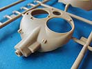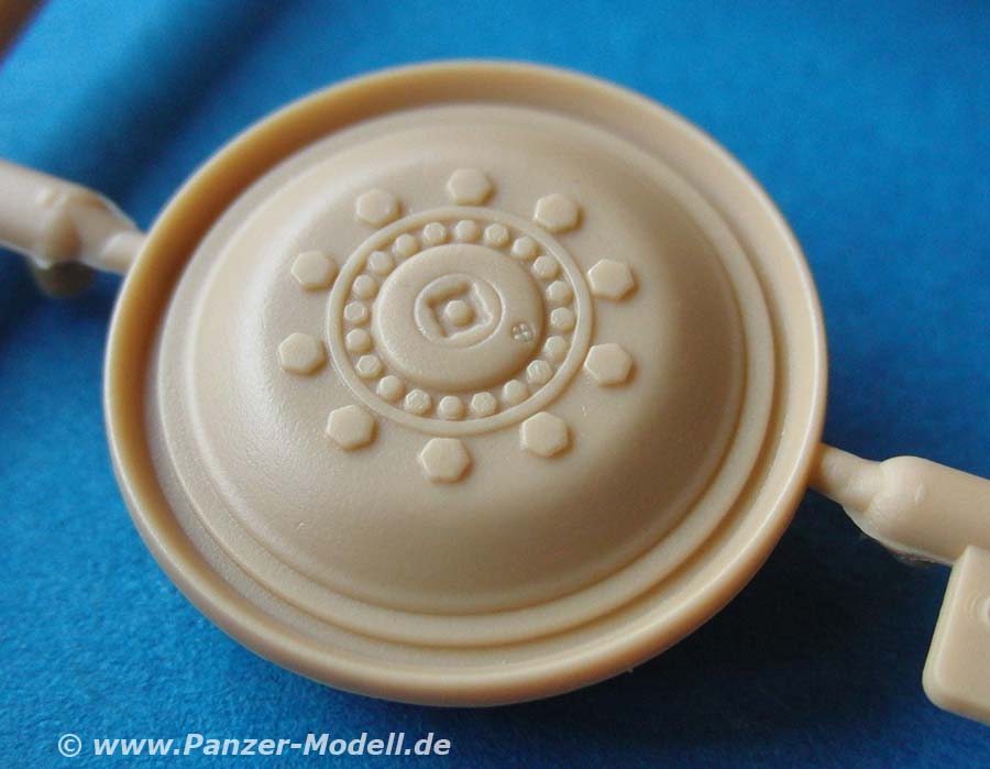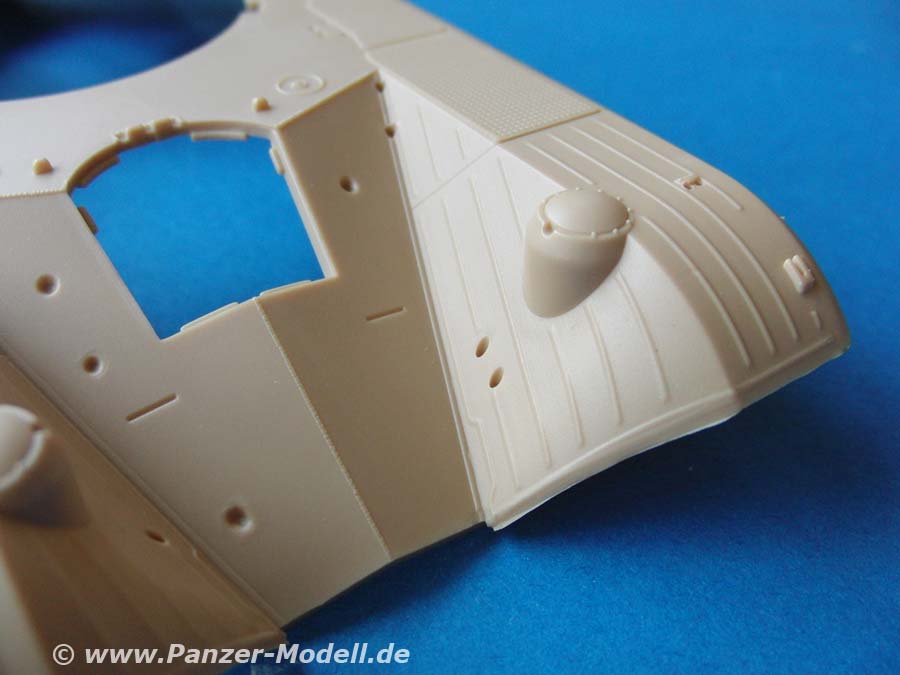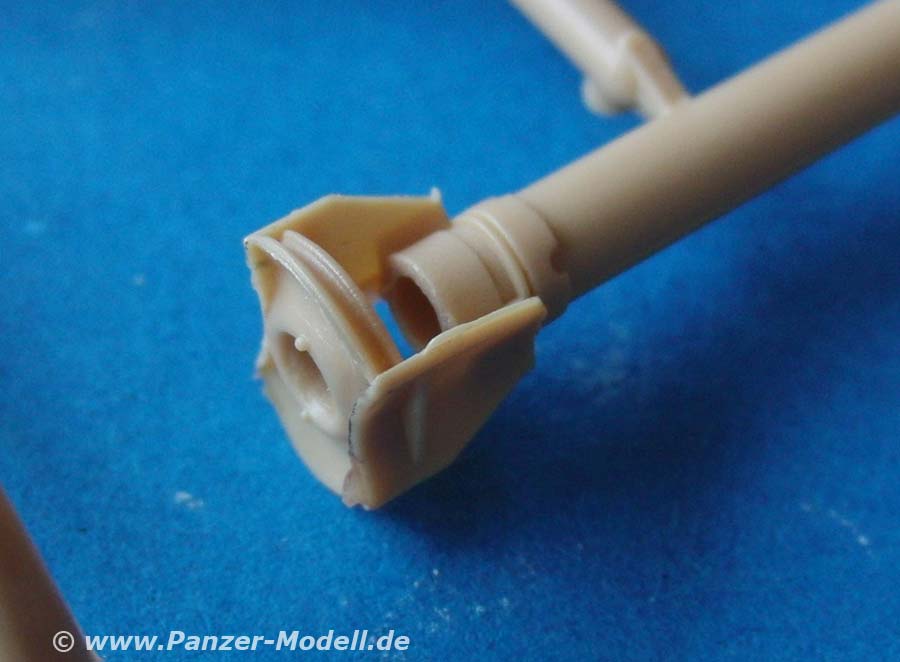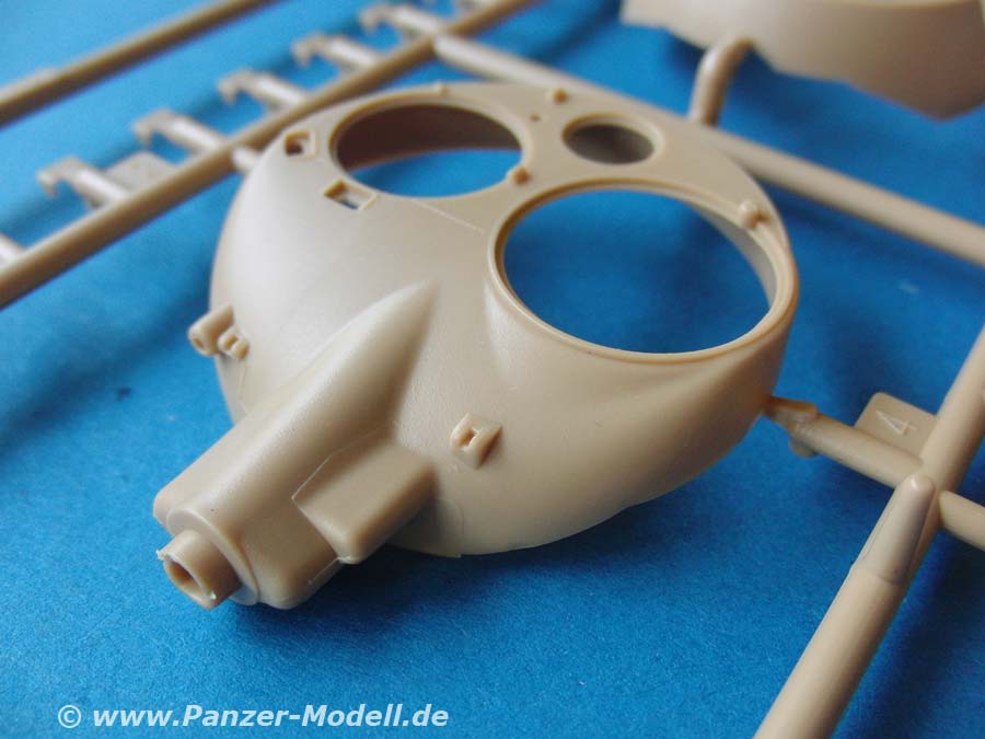Der neue Turm ist die niedrige Bauform mit der 75mm Kanone und setzt sich aus recht wenigen Teilen zusammen. Die Besonderheit des Turms ist das komplett höhenschwenkbare Oberteil, was auch im bausatz so dargestellt ist. Die vordere Schutzplane und auch der Staukorb sind in jeweils einem Spritzgussteile gemacht - sehr beeindruckend. Auch gut gefällt die Kanone in einem Stück mit der auffälligen und gut gemachten Mündungsbremse.