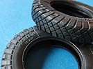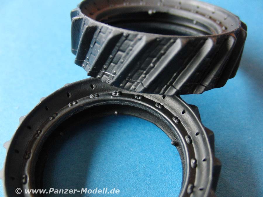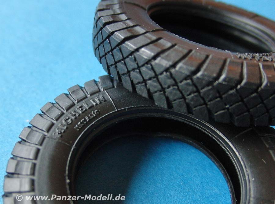 Die Vinylreifen sind auch wieder sehr gelungen - sehr schönes und feines Profil und Herstelleraufdrucke. Die Stahlräder sehen auch erstaunlich gut aus in einem Stück mit Details an allen Seiten und verschränkten Stegen auf der Lauffläche. Allerdings scheint die Form seit dem ersten Bausatz schon etwas gelitten zu haben, denn ich bilde mir ein, einen Formrand und etwas softere Details zu sehen. Aber immer noch sehr schön anzusehen.