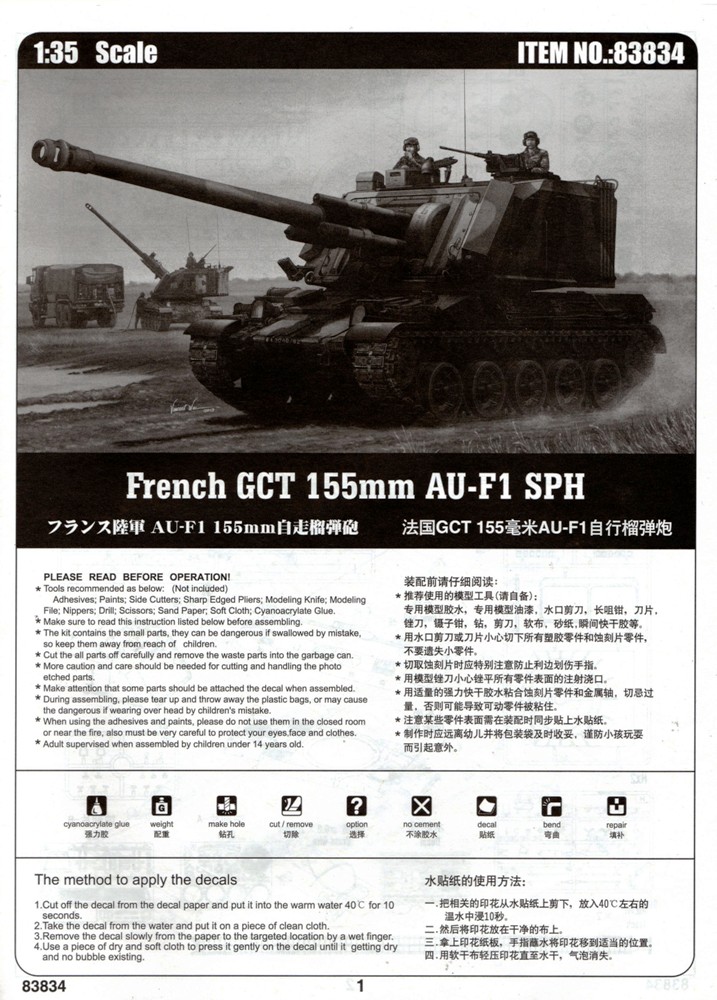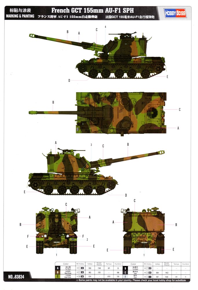 Die Hobby Boss typische schwarz-weiße Bauanleitung beginnt wie immer mit einer Spritzlingübersicht. Die Bauanleitung mit 26 sinnvoll aufgeteilten und leicht verständlichen Schritten ist angenehm für die Augen. Immer wieder gibt es Unterbaugruppen, die die großen Bauschritte entzerren. Bemalungsvorschläge für 1 Fahrzeug der französischen Armee in Nato 3-Farbtarnung findet man auf dem farbigen Zusatzblatt. Farbangaben werden für Mr. Hobby, Vallejo, Model Master, Tamiya und Humbrol Farben gemacht.