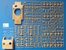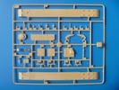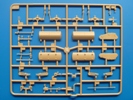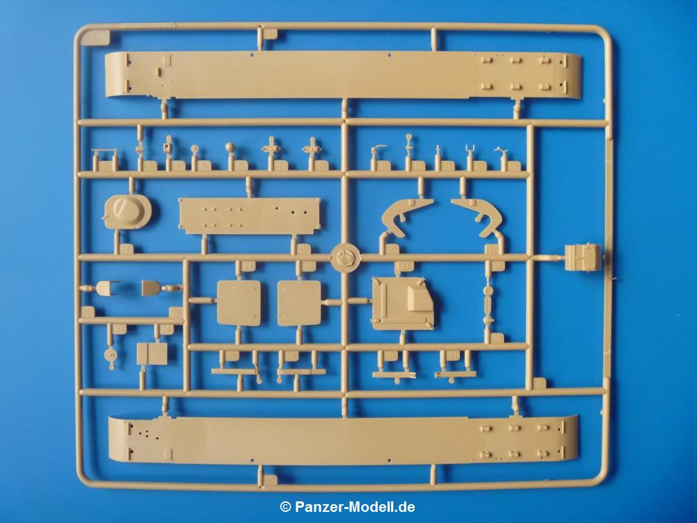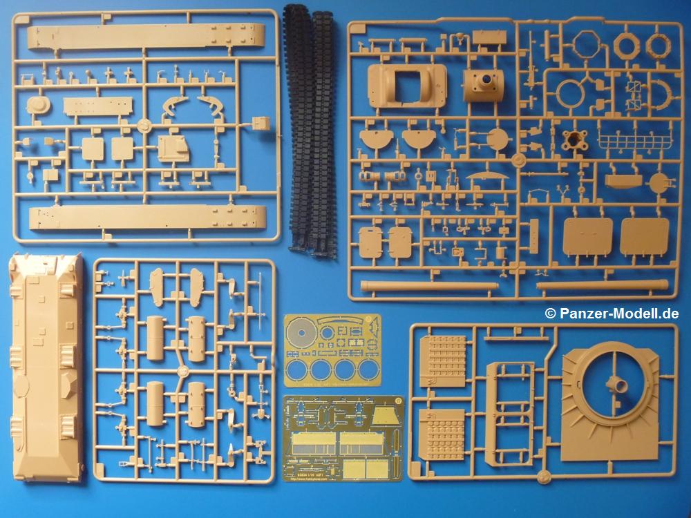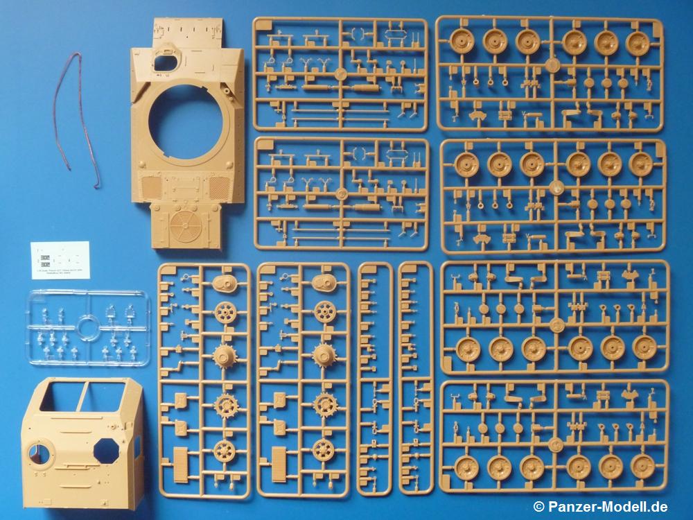 14 sandgelbe und 1 glasklarer Spritzling, Ober- und Unterwanne, Turmoberteil, zwei Ätzteilplatinen, zwei Vinylketten, ein Stück Kupferdraht und ein Abziehbilderbogen (Decals), eine 20-seitige Bauanleitung und eine 1-seitige farbige Bemalungsanleitung stellen den Inhalt des Kartons dar. Ober- und Unterwanne sind wie so oft bei Hobby Boss in einem Extrafach im Karton geschützt aufgehoben.