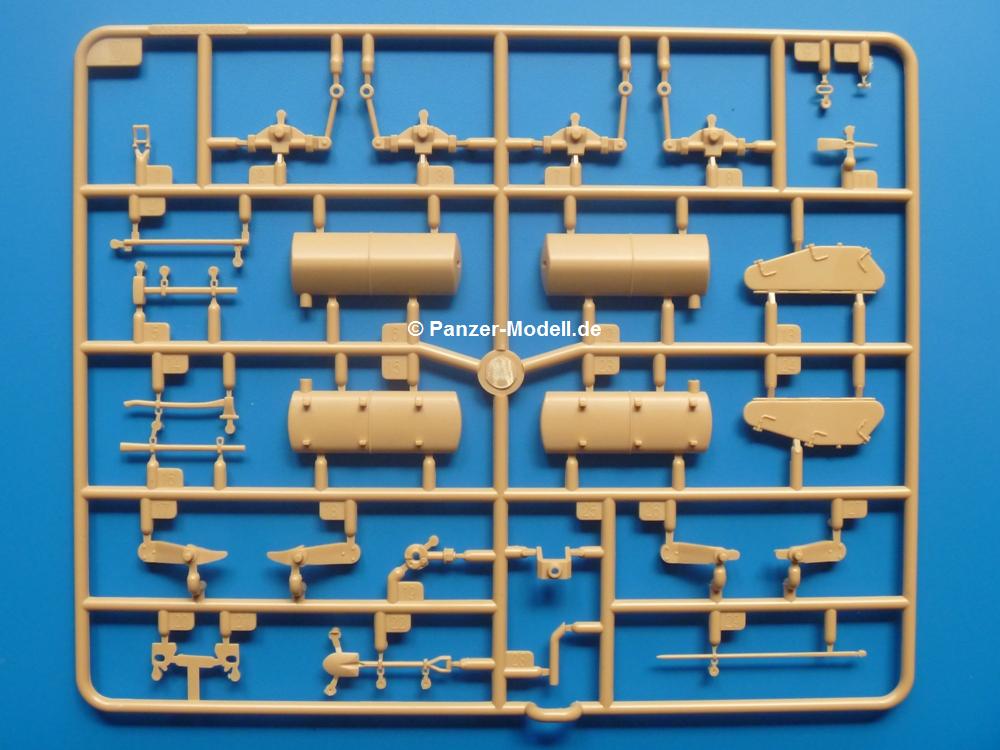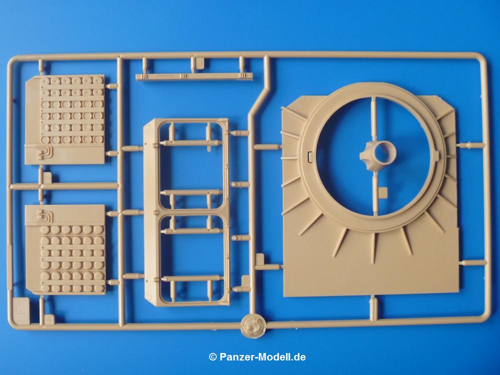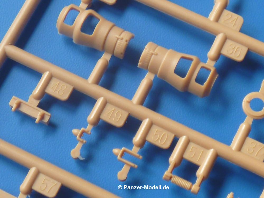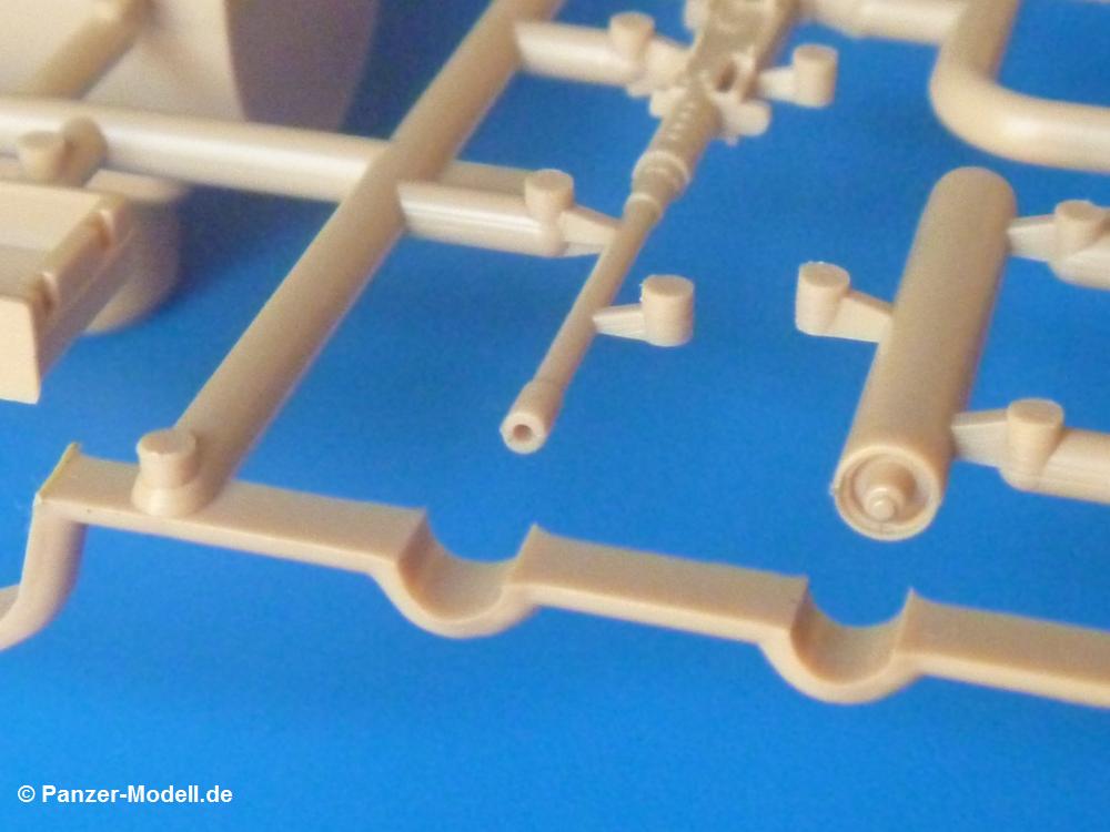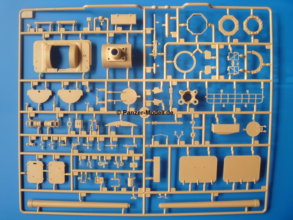 Der riesige Turm kommt ohne Inneneinrichtung aus. Nur die beiden großen Munitionsbunker im Heck sind so dargestellt, dass man beim Blick von außen (Beladungsszene) auf die Munition schaut. Durch die gelungene Darstellung lässt man gern die Klappen offen, zumal man sich ja hier auch farblich austoben kann, sieht man Originalfotos. Die Blende mit den außen liegenden Rückstossdämpfern und Rohrvorholern sieht äußerst geschäftig aus. Turmluken und Türen liegen separat bei und weisen auch Innendetails auf. Die Winkelspiegel des Kommandanten sind Klarsichtteile, der Suchscheinwerfer und sein "Glas" auf dem Turm wiederum nur aus sandgelbem Plastik. Das Rohr besteht aus 2 Hälften, die zusammengesetzt noch einen Ätzteilring erhalten. Auf die Mündung kommt die 2-geteilte Mündungsbremse mit einem Abschlussring. Das cal.50 MG besteht nur aus wenigen teilen, ist aber schön detailliert und die Mündung ist bereits aufgebohrt. Der dazugehörige Munitionskastenhalter macht was her, aber enthält keinen Munitionskasten mit der cal.50 Munition.
