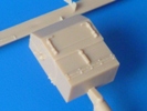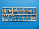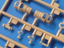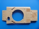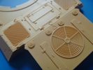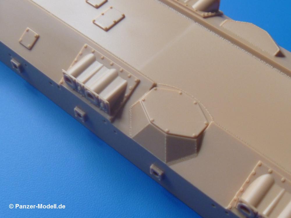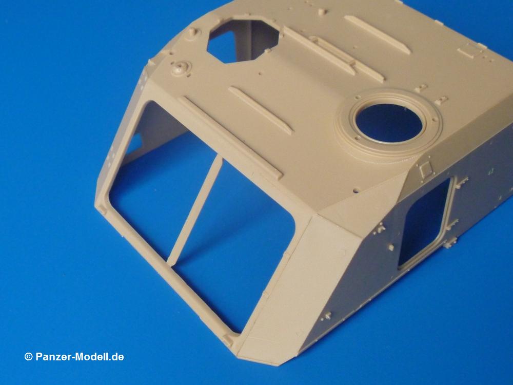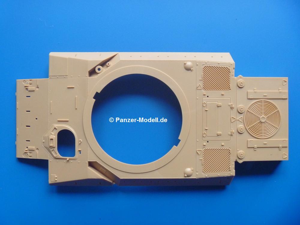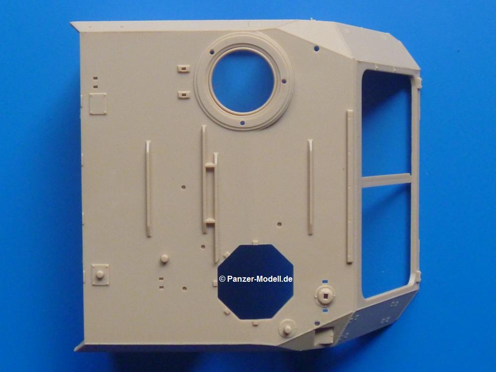 Der riesige Turm kommt ohne Inneneinrichtung aus. Nur die beiden großen Munitionsbunker im Heck sind so dargestellt, dass man beim Blick von außen (Beladungsszene) auf die Munition schaut. Durch die gelungene Darstellung lässt man gern die Klappen offen, zumal man sich ja hier auch farblich austoben kann, sieht man Originalfotos. Die Blende mit den außen liegenden Rückstossdämpfern und Rohrvorholern sieht äußerst geschäftig aus. Turmluken und Türen liegen separat bei und weisen auch Innendetails auf. Die Winkelspiegel des Kommandanten sind Klarsichtteile, der Suchscheinwerfer und sein "Glas" auf dem Turm wiederum nur aus sandgelbem Plastik. Das Rohr besteht aus 2 Hälften, die zusammengesetzt noch einen Ätzteilring erhalten. Auf die Mündung kommt die 2-geteilte Mündungsbremse mit einem Abschlussring. Das cal.50 MG besteht nur aus wenigen teilen, ist aber schön detailliert und die Mündung ist bereits aufgebohrt. Der dazugehörige Munitionskastenhalter macht was her, aber enthält keinen Munitionskasten mit der cal.50 Munition.