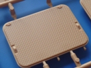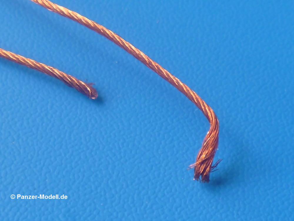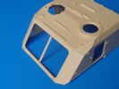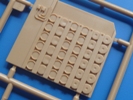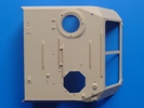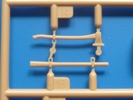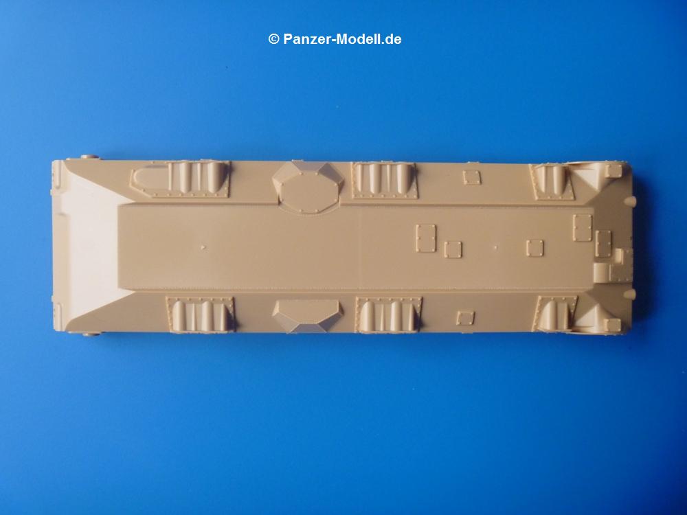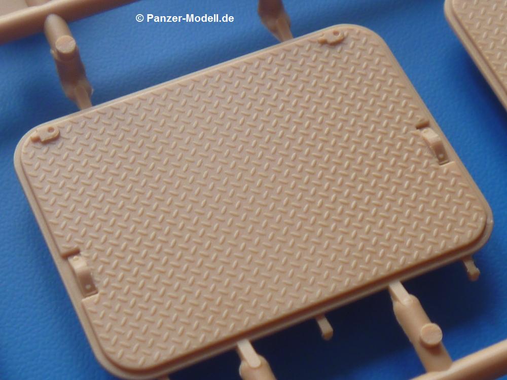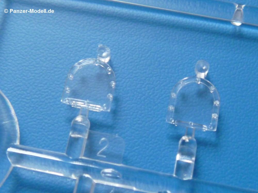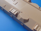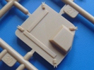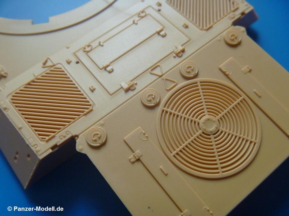 Eckig und winkelig ist auch die Oberwanne. Hier sind schon viele Details wie Wartungsdeckel und Griffe angegossen, kommen aber sehr schön zur Geltung. Ausnahme sind die halboval-förmigen Ösen an den länglichen Wartungsklappen links und rechts des Lüftergitters. Die sind etwas zu flach und man mag vielleicht dazu tendieren, diese abzuschleifen und durch Drahtbügel zu ersetzen. Jede Menge Anbauteile der Wanne lassen keine Langeweile aufkommen. Bei den Fahrerwinkelspiegel hat man die Wahl zwischen normalem Plastik und Klarsichtteilen. Bei den Blinkern, Rück- und Begrenzungsleuchten muss man sich mit normalem Plastik zufrieden geben. Nur die Hauptscheinwerfer erhalten ihre Gläser aus Klarsichtmaterial. Am Heck werden Kraftstoffkanister mit ihren Halterungen angebracht. Sehr schön anzusehen, aber wer bisher noch keine Erfahrung mit Ätzteilen hat, muss sie hier sammeln, denn es gibt keine Alternativteile. Mit den gewonnenen Kenntnissen bereiten dann das geätzte Lüftergitter und die Schutzgitter über den außen liegenden Auspufftöpfen keine Probleme mehr. Überhaupt gefällt mir die ausgewogene Mischung aus separaten und angegossenen Teilen hier. Etliche Griffe, Deckel etc angegossen, ohne an Detail zu verlieren, aber genug Einzelteile, damit keine Langeweile aufkommt. Ein sehr schönes Detail stellt das Abschleppseil aus verwundenem Kupferdraht dar. Wie das Original aus vielen einzelnen dünnen Drähten verdreht eine Erholung für die Augen gegenüber den Gummi- oder Plastikseilen, die es immer noch bei anderen Herstellern gibt.