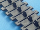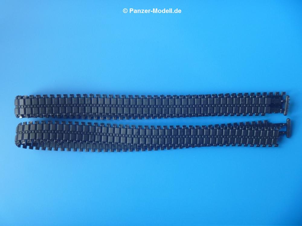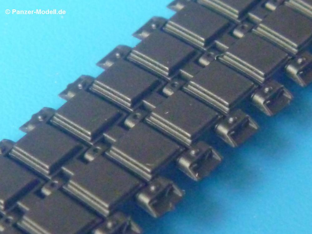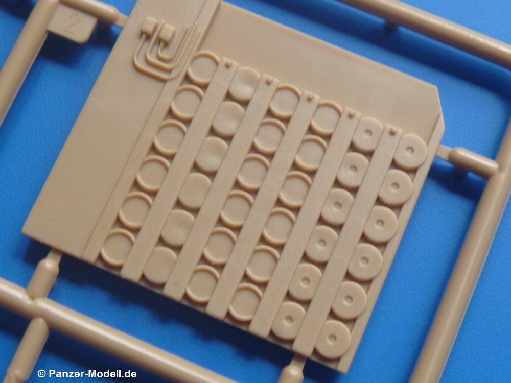 Schon die Unterwanne mit ihren Ecken und Winkeln, Wartungsdeckeln und Aufnahmen für die Schwingarme zieht die Aufmerksamkeit auf sich. Da lohnt es sich fast, eine auf die Seite geworfene AU-F1 zu bauen. Verstärkungsstreben und Verschraubungen geben den Laufrollen einen besonderen Touch, doch die Details sind etwas weich. Man kann kaum erkennen, dass es sich um Sechskantschrauben handeln soll. Da sehen die Schrauben an den Antriebszahnkränzen schon besser aus. Das Laufwerk wird einen schon eine Weile beschäftigen, denn außer den Schwingarmen muss man Anschlag- und Stossdämpfer, Seitenvorgelege, Stützrollen und Schwingarmfederung/dämpfung (?) anbauen. Die Kette besteht zwar pro Seite aus einem Vinylstrang, hat aber tolle Details und…stellt anders als bei den Konkurrenten die neuere Diehl-Kette mit 2 Kettenpolstern pro Glied dar.