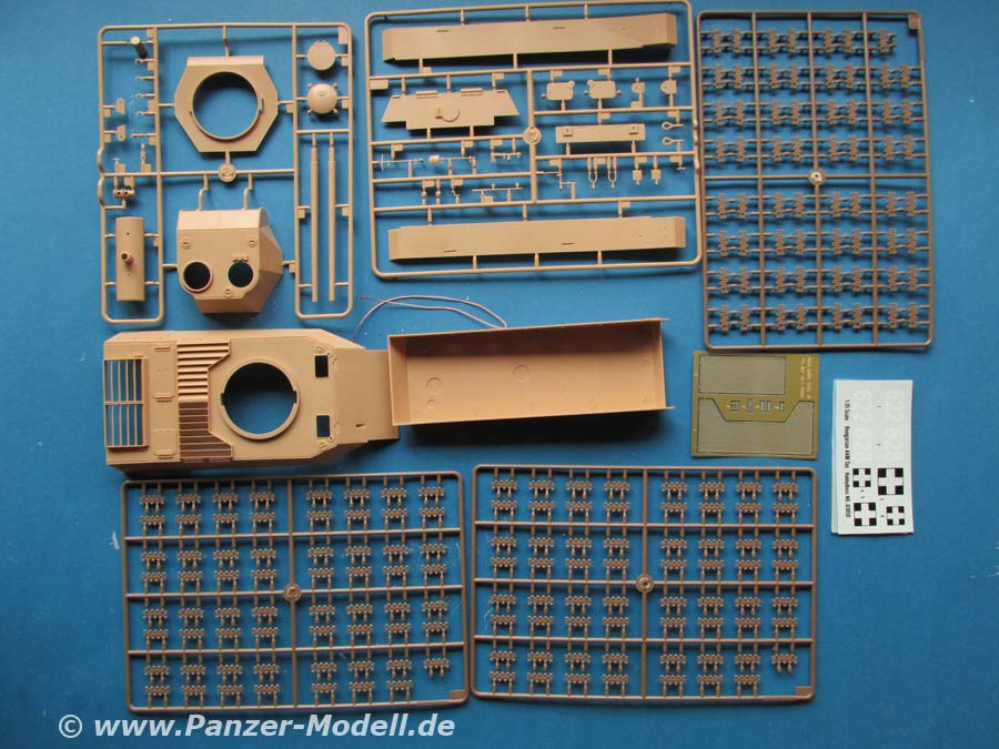 Im Karton finden wir 11 Spritzlinge, Ober- und Unterwanne, PE Teile, Kupferlitze und ein Decalbogen.
