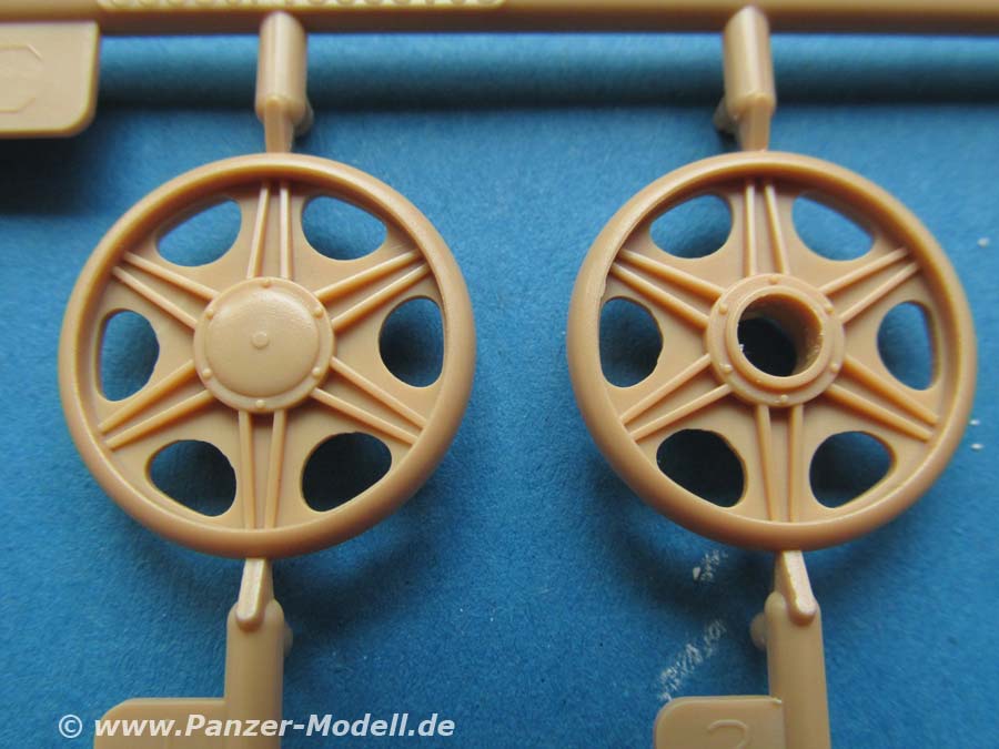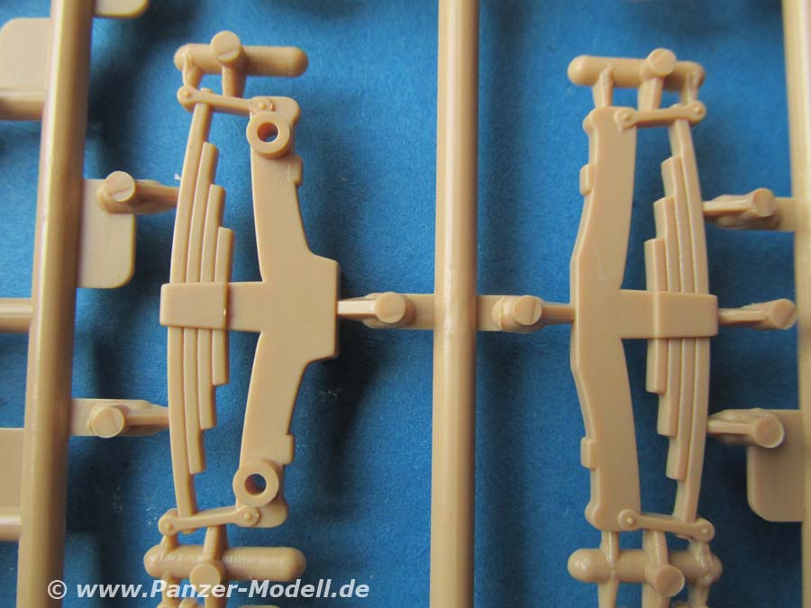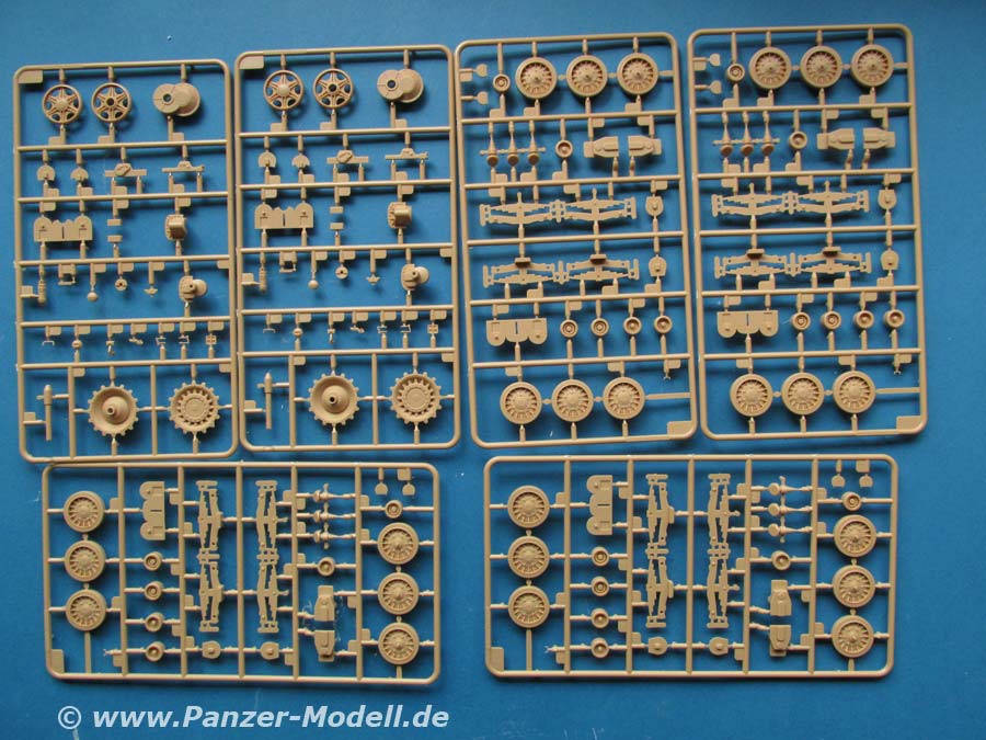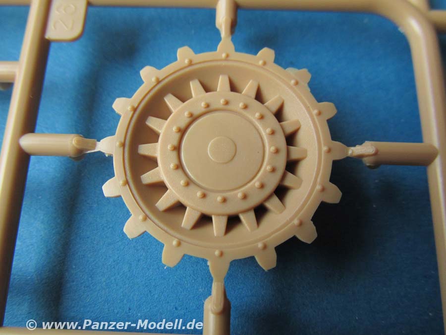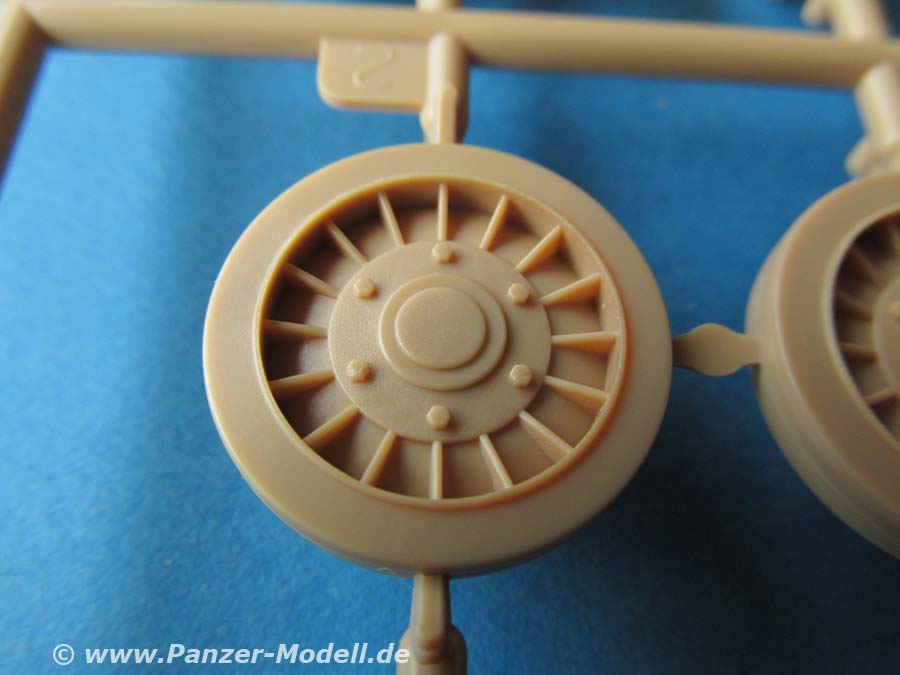 Die Ober- und Unterwanne sind jeweils in einem Stück gemacht, das Laufwerk mit den federungselementen wird von aussen auf die Wanne geklebt udn alle Räder angeklebt. Diese bleiben nicht beweglich. Sämtliche Räder machen einen sehr guten Eindruck mit exakten Details, sowie schönen Rippen und Durchbrüchen.