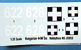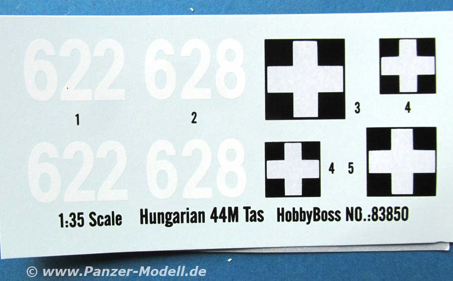 Für die Bemalung/Markierung liegt ein einseitig farbig gedruckter DIN A4 Bogen bei, der zwei Versionen in gelb/grüner Tarnung mit entweder Turmnummer 628 oder 622 der ungarischen Armee zeigt.