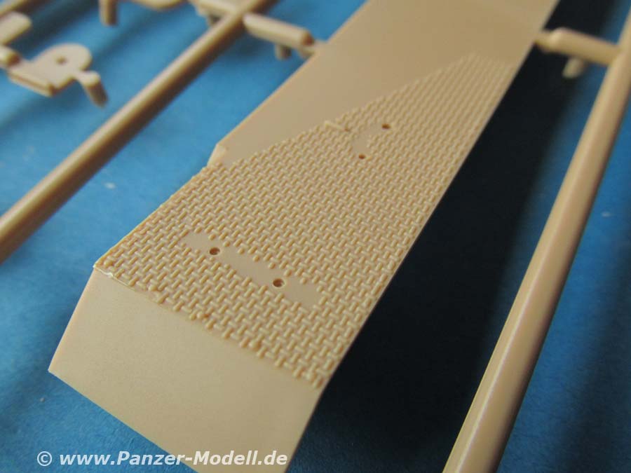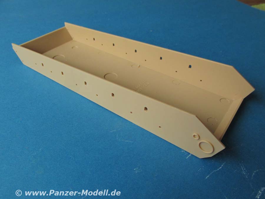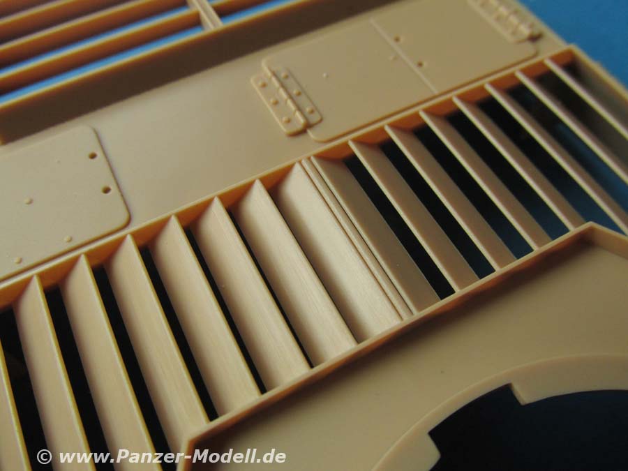 Die Oberwanne wird mit den Kettenblechen versehen, welche ein schönes Riffelmuster aufweist. Das Motordeck weist rech große Lufteinlass- und auslassschlitze auf, die von unten mit PE Gitter verschlossen werden.