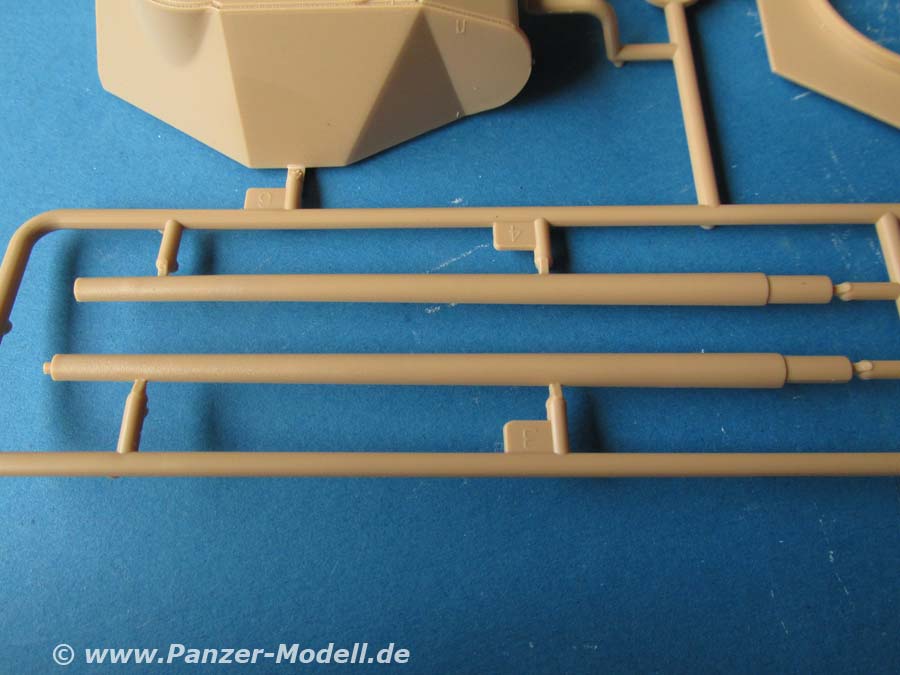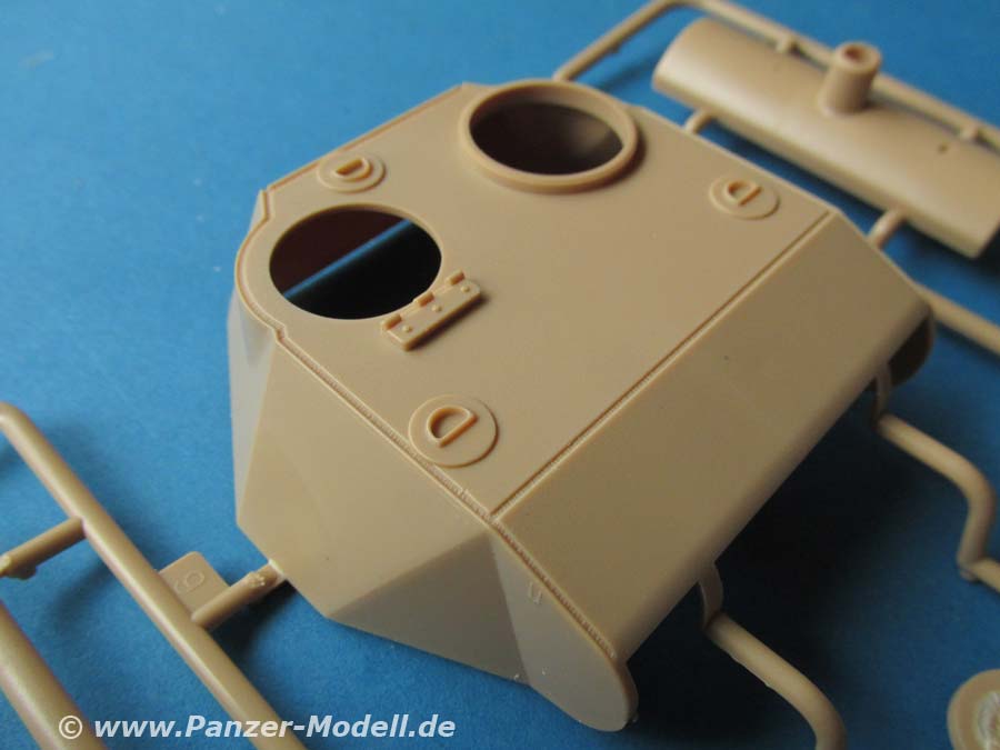 Der Turm setzt sich aus wenigen Teilen zusammen. Die Kanonenblende ist offenbar beweglich gestaltet und das Kanonenrohr in zwei Halbteilen, was zu einer unschönen Naht führt. Die Turmluke läasst sich offen oder geschlossen bauen.