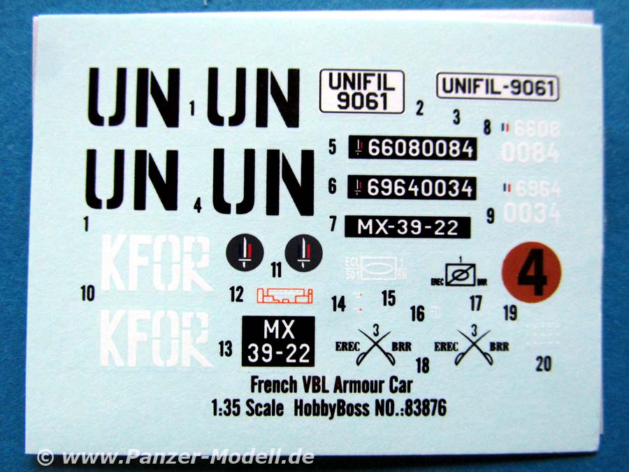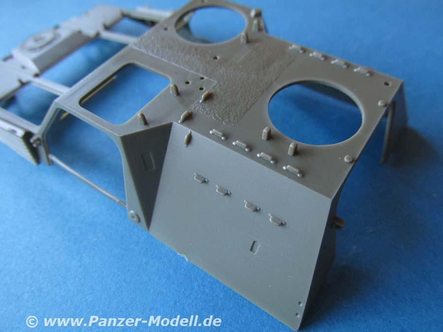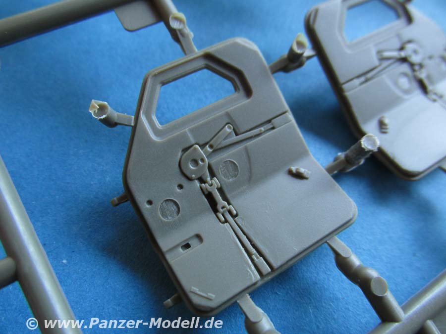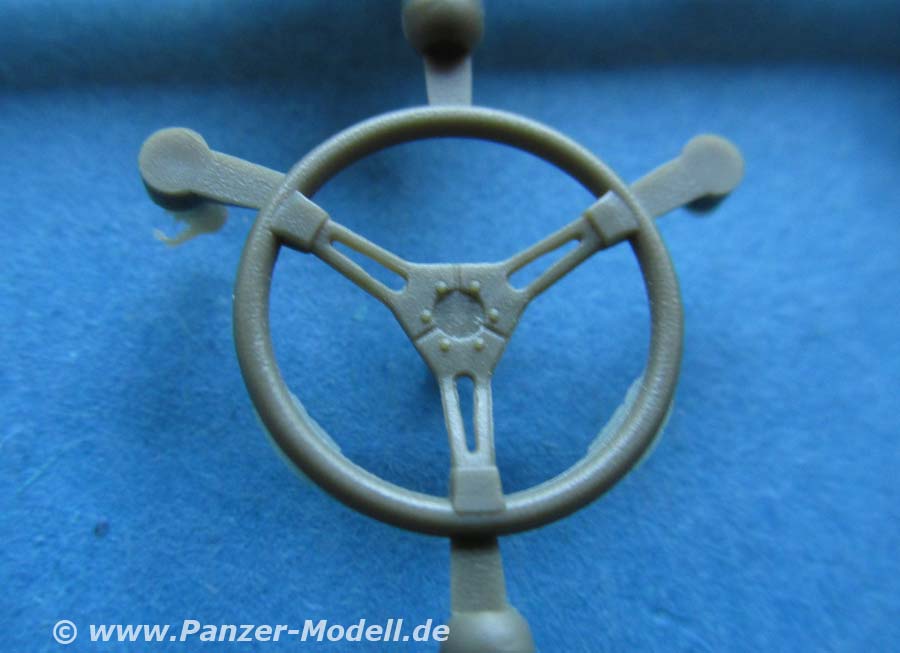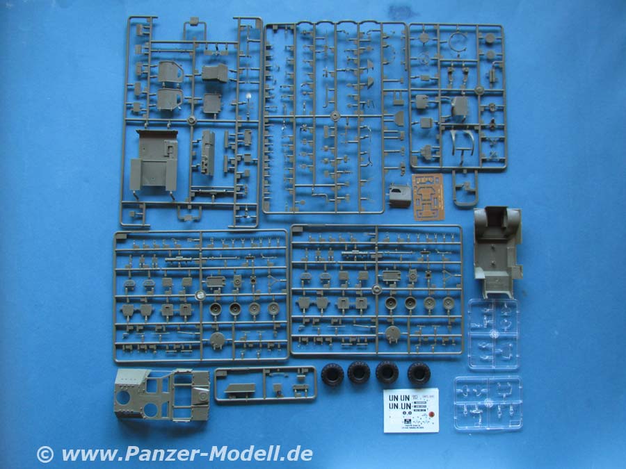 Im Bausatz finden sich 6 olivgrüne Spritzlinge, 2 klare Spritzlinge, die Unterwanne, die Oberwanne, eine Tür, 4 Vinylreifen, eine PE Platine und ein Decalbogen. Die Qualität der Bauteile ist wie zuletzt gewohnt in hervorragendem und fehlerfreiem Guss. Keine verzogenen Teile, keine Defekte oder Plastikausflüsse oder Formversatz. Alles optisch sehr gefällig. Die schwarzweiße Bauanleitung beginnt wie immer mit einer Spritzlingübersicht. Von einigen Unterbaugruppen begleitet führt die Bauanleitung in lediglich 11 sinnvoll aufgeteilten und leicht verständlichen Schritten zum fertigen Modell.Das farbig gedruckte A4 Zusatzblatt gibt Markierungs- und Bemalungsvorschläge für 4 Fahrzeuge an, wobei die verschiedenen Markierungen ohne genauere Erklärung angegeben sind. Farbangaben werden für Mr. Hobby, Vallejo, Model Master, Tamiya und Humbrol Farben gemacht. Das Modell ist relativ klein, dafür aber unheimlich detailliert. Der Preis von rund 35 Euro geht hier gerade noch so in Ordnung