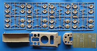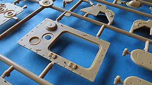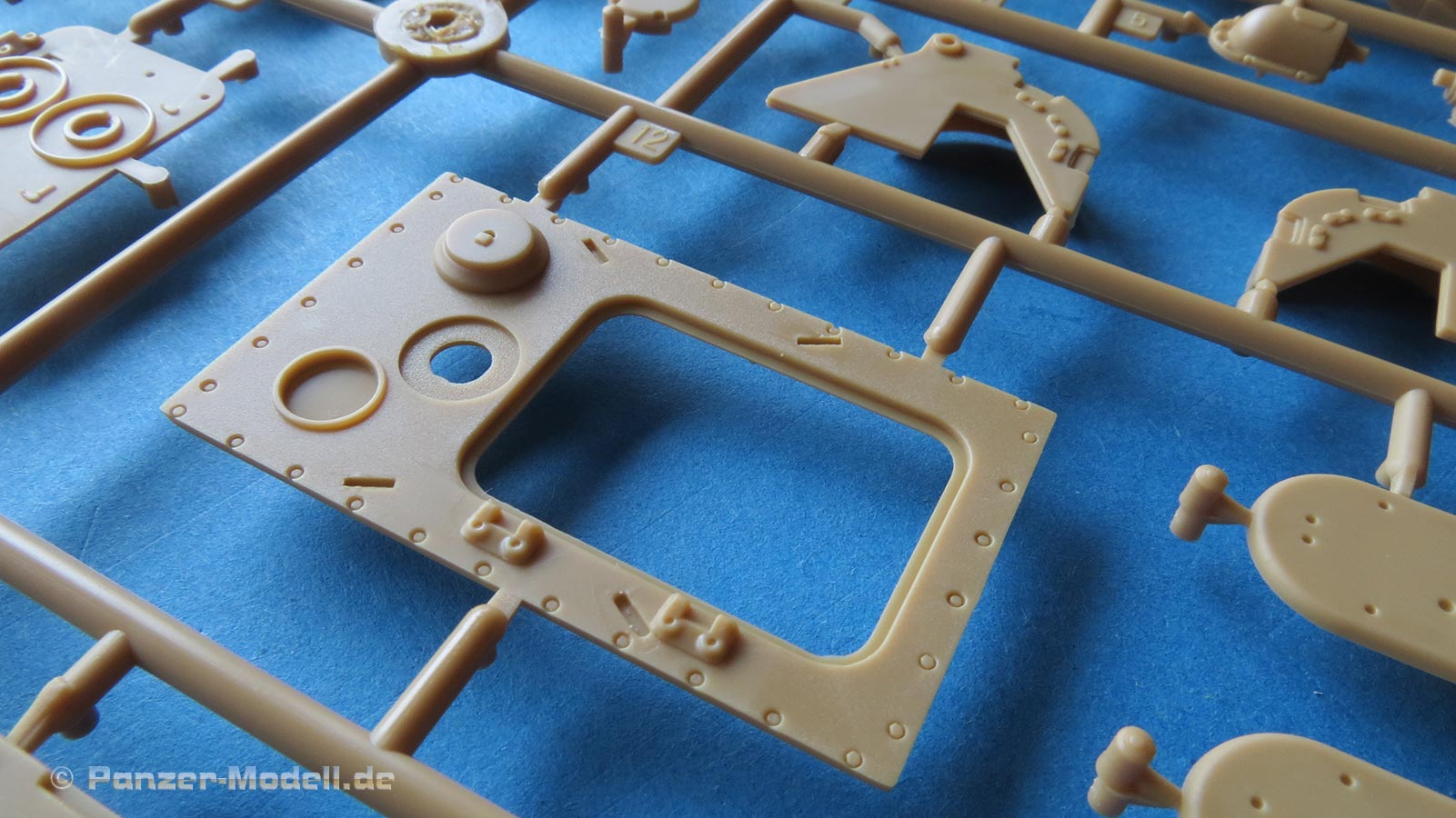 Im Bausatzkarton finden wir 9 beige Spritzlinge, 19 bräunliche Spritzlinge, Oberwanne, Unterwanne, Turmoberteil, 2 PE Platinen und ein Decalbogen.