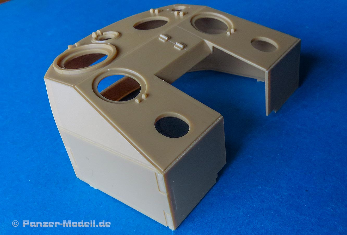 Die Oberwanne ist einteilig gespritzt und eindeutig mit den Merkmalen der frühen Panther ausgestattet, die dem "Knick" in den seitlichen Längswänden, dem "Briefkastenschlitz" statt MG Kugelblende, lange, zweilteilige vordere Kettenbleche, usw. Wir finden hier recht schöne, feine Schweißnähte und offene Luken, gerade auch auf dem Motordeck.