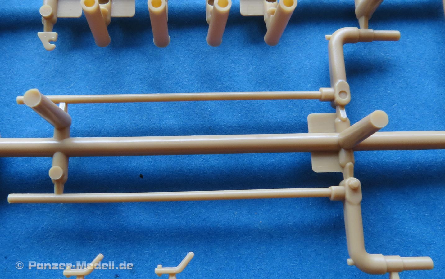 Das Bordwerkzeug ist soweit vollständig und in Plasti gespritzt und macht einen durchaus brauchbaren Eindruck. Etwas seltsam mutet die lange Röhre auf der linken Seite an, die an sich für das Rohrreinigungsgerät der 7,5cm KwK des Panther gedacht war - wäre der Coelian in Serie gegangen, wäre hier sicherlich ein Tausch vorgenommen worden - momöglich mit Ersatzrohren für die 3,7cm Flak.
