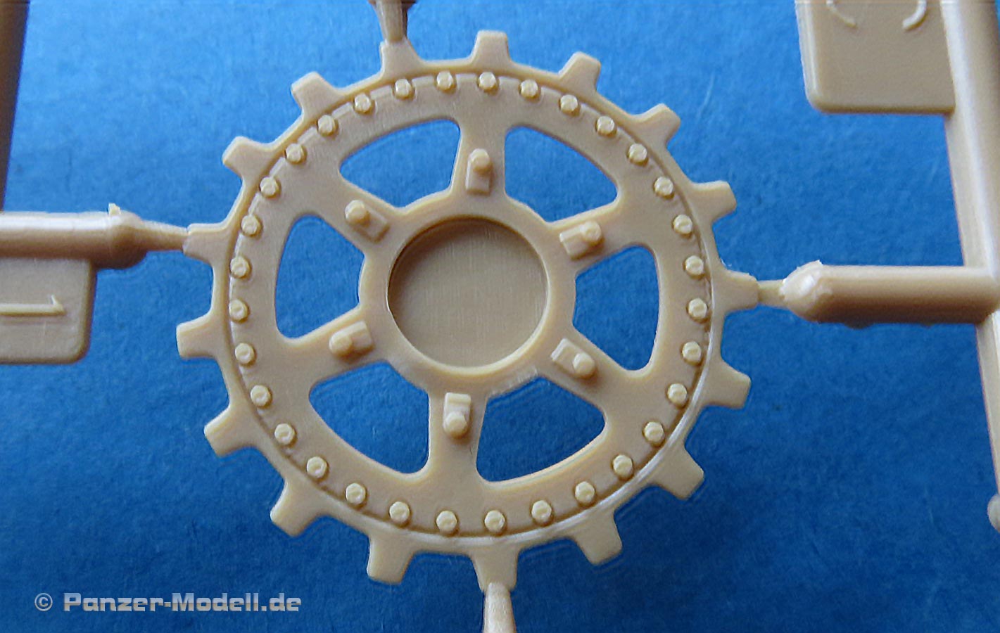 Die Laufrollen machen einen guten und fein detaillierten Eindruck mit der Wölbung der Felge den ganzen Bolzen und der abgesetzten Gummierung. Auf dieser sind allerdings keinerlei Herstelleraufdrucke zu entdecken.