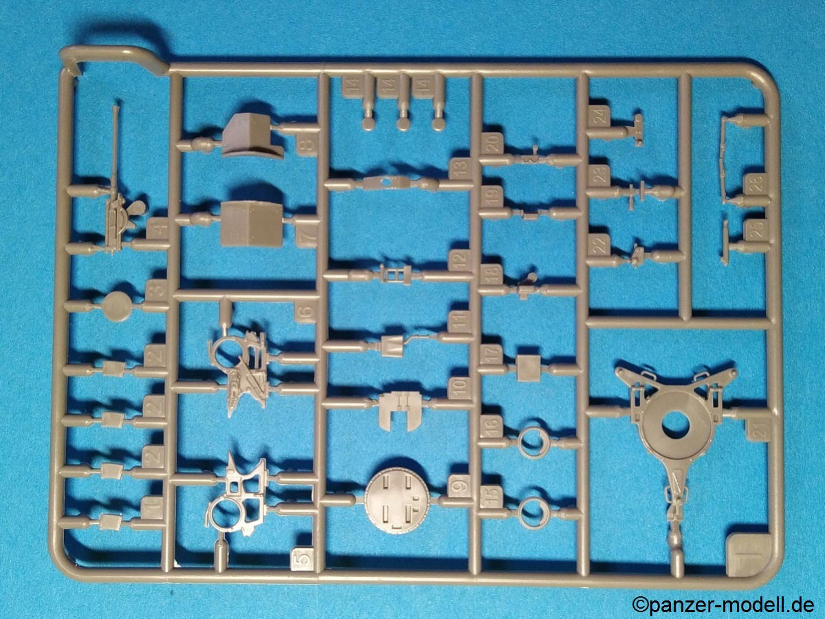 Aus dem vorliegenden Bausatz lassen sich zwei komplette Geschütze inkl. Protze bauen in aufgeprotzter und abgeprotzter Version bauen. Die Detailierung und Gravierung der Teile ist IBG-typisch gut. Die Angüsse sind so gewählt, dass man diese gut entfernen kann. Auf den Bauteilen sind keine nennenswerten Auswerfermarken auf später sichtbaren Stellen zu sehen. Die Protze besteht aus nur wenigen Teilen, ist aber gut detailliert. Hier müssen lediglich Rahmen, Radaufhängungen und Räder zueinander finden. Die Räder an sich sind einteilig, dadurch gibt es keine lästigen Nähte in den Laufflächen, die es zu verspachteln gilt. Bei der Waffenanlage muss eine Mischung aus Spritzgussteilen und Fotoätzteilen verbaut werden. Filigrane Teile wie Visier, Schutzschild und Hülsenfangkorb sind aus Fotoätzteilen zusammenzubauen. Das Rohr ist als Spritzgussteil ausgeführt, bietet aber als Highlight eine Öffnung an der Rohrmündung. Wem das nicht ausreicht, der kann auf gedrehte Rohre aus dem Zubehörhandel zurückgreifen. Die Bauanleitung ist zweisprachig ausgelegt. Es gibt Hinweise in polnischer und englischer Sprache. Sie ist sehr detailliert und übersichtlich aufgebaut. Zu Beginn findet man eine Übersicht der enthaltenen Decals und Fotoätzteile sowie Farbangaben für die Hersteller Vallejo, Hataka, Life Color, Mr. Hobby, und AK Interactive. Im Weiteren folgt dann eine Übersicht der enthaltenen Gießäste. Danach folgt die eigentliche Bauanleitung, die sich in 9 Baustufen gliedert. Hier wird pro Baustufe anhand von einfarbigen 3D-Zeichnungen Schritt für Schritt der Weg zum fertigen Modell dargestellt bzw. erklärt. Den Abschluss der Anleitung bilden zwei verschiedene Bemalungs- und Markierungsvarianten. Hier werden aber nur zwei einfarbige Varianten in Panzergrau und Dunkelgelb mit verschiedenen Abschussmarkierungen gezeigt. Tatsächlich nachgewiesene Einsatzvarianten wären hier schöner. Mein Fazit: IBG bringt mit diesem „Doppelpack“ ein detailreiches kleines Model auf den Markt was viele Modellbauer begeistern wird. Der Preis für die dargebotene Zusammenstellung von Spritzgussteilen und Fotoätzteilen im „Doppelpack“ sind mehr als ok und sucht seines gleichen. Der Aufbau und die Detailierung des Bausatzes und der enthaltenen Bauteile lassen viel Bastelspaß erwarten und führen zu einem fein detaillierten Modell. Wenn auch der Einsatz der Fotoätzteile den Bausatz nicht gerade für den Anfänger geeignet macht. Für den aufgerufenen Preis von 8,50 Euro für zwei Modelle daher eine absolute Kaufempfehlung!