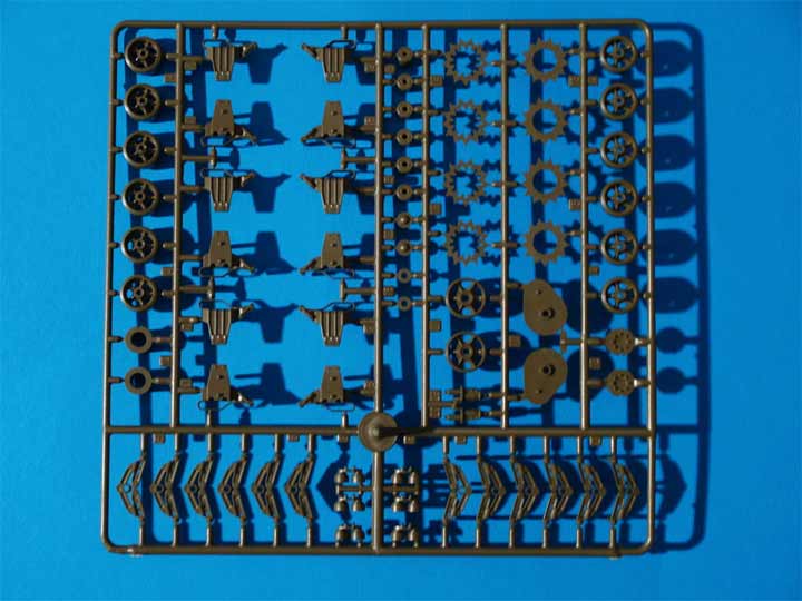 Auf drei Spritzlingen verteilen sich die Einzelteile aus olivem Plastik. Zusätzlich gibt es noch eine Vinylkette und einen kleinen Decal-Bogen. Die Anleitung führt in 13 Schritten zum Ziel.