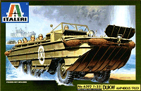 Einen Monat früher als geplant erschien nun das lang erwartete DUKW als Neuheit des italienischen Herstellers. Das DUKW war (oder besser ist) die amphibische Version des US-amerikanischen 2,5 to LKW "Jimmy" oder auch "Deuce and a Half" genannt. Das "Duck" von Italeri präsentiert sich nach dem Öffnen der Schachtel an drei sauber produzierten oliven Spritzlingen. Zusätzlich ist noch ein winziger "klarer" Spritzling für die Windschutzscheibe und die Scheinwerfergläser vorhanden, doch dazu später mehr. Das verwendete Plastikmaterial ist "weich" und nicht spröde und lässt sich gut verarbeiten. Die Qualität der Gravuren ist als gut zu bezeichnen, auch wenn sie an manchen Stellen durchaus etwas schärfer sein könnten. Ein Manko sind die aufgeprägten "Gitter" vor dem Schacht für die Luftzufuhr des Motors. Diese können aber leicht durch entsprechendes Gittermaterial bzw. durch die sicher bald erscheinenden Ätzteile ersetzt werden. Ein zweiter Kritikpunkt betrifft den schon erwähnten klaren Spritzling, welcher die Scheiben viel zu dick darstellt, was aber kein Drama ist, da diese ebenfalls leicht ersetzt werden können (Klarsichtmaterial von Blisterpackungen o.ä.). Letzter Kritikpunkt, welcher aber eigentlich keiner ist, sind die Öffnungen in den Verstärkungsrippen an den Seitenwänden. Obwohl diese an "heutigen" DUKW eigentlich die Regel sind, waren sie an den im Zweiten Weltkrieg eingesetzten Fahrzeugen nicht zu finden (jedenfalls nicht in meinem Referenzmaterial), so dass es sich vermutlich um eine Nachkriegsmodifikation handelt. Diese Öffnungen an Italeris Modell können aber leicht zugespachtelt werden, und es wird sicher nicht jeder ein "Weltkriegsmodell" darstellen wollen. Trotz dieser drei Kritikpunkte wird man mit einem wunderschönen Modell des wohl erfolgreichsten Amphibienfahrzeuges belohnt. Die Formen des Originals wurden von Graveuren fein ins Modell umgesetzt und auch viele kleine Details erfreuen den Modellbauer. Die Bauanleitung ist Italeri-typisch aufgebaut, also wirklich gut, und auch der Decal-Satz weiß zu überzeugen. Wem allerdings die drei Optionen zu wenig sind, der kann ja seine Referenzen zu Rate ziehen und verschiedene Versionen selbst "kreieren", z.B.: Bundeswehr, THW, Royal Marines, Frog Tours London, usw. (Review von Sven Schröder)