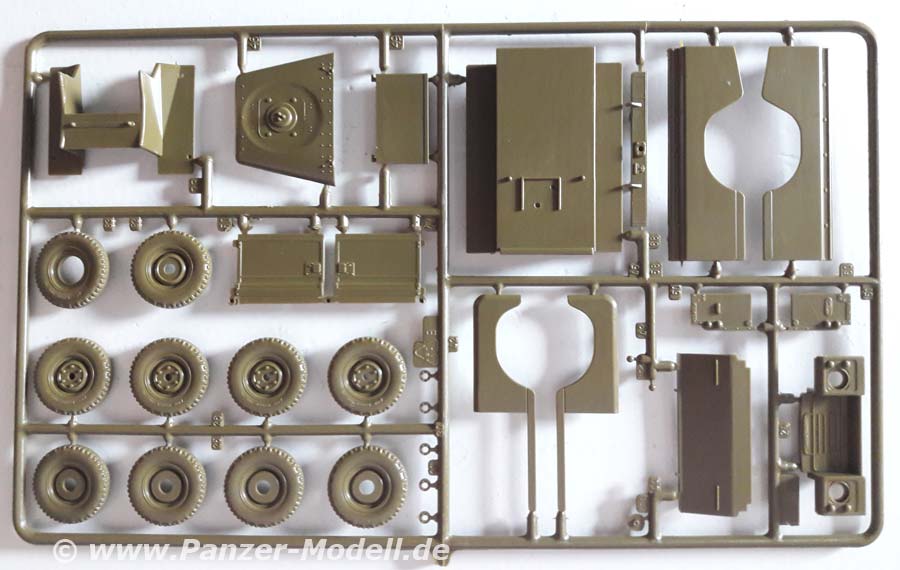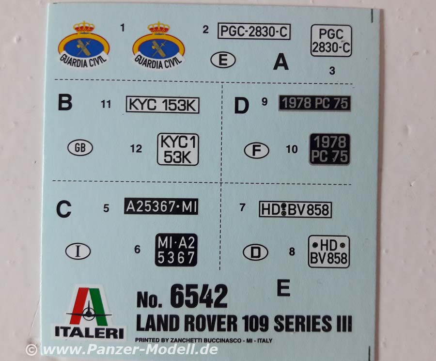 LAND ROVER SERIES III 109 "Guardia Civil" 1:35Der Land Rover wurde am Ende der 40er Jahre entwickelt um ein Universalfahrzeug für die Landwirtschaft zu schaffen. Schnell stellte sich jedoch das Potential des Fahrzeuges heraus und es wurde in vielen verschiedenen Bereichen eingesetzt. Ein Großteil der Fahrzeuge wurde bei Militär und Polizeieinheiten in der ganzen Welt eingesetzt. Auch die spanische paramilitärische Polizeieinheit „Guardia Civil“ hatte verschieden Land Rover oder spanische Lizenzbauten von „Santa Ana“ im Einsatz. Italeri präsentiert uns hier eine eher ungewöhnliche Version des ab 1971 Land Rover Series III. Es handelt sich um den 3-Door Station Wagon viel häufiger wäre der 5-Door Station Wagon. Warum haben sich die Italiener dennoch für diese Version entschieden? Ganz einfach: Wir finden im Kasten als Grund Modell den guten alten Italeri Bausatz des Land Rover 109 mit Plane. Gepimpt wurde dieser mit neu entwickelten Bauteilen für den Station Wagon. Um sich einen kompletten Austausch der Seitenteile zu sparen, entschied man sich nun für die Version mit 3 Türen. Der Bausatz präsentiert sich Gratfrei und sauber gegossen. Verteilt auf 3 Spritzlinge in oliven und einen in durchsichtigen Plastik finden sich ca. 70 Bauteile. Feine Gravuren und Details erfreuen das Modellbauerherz. Qualitativ bewegen sich die neuen Bauteile auf einer Stufe mit den alten Bauteilen solide Hausmannskost. Für die Verglasung den neuen Hecks liegen extra dünne Folien bei wie diese nach dem Bau wirken kann ich noch nicht genau sagen. Da das Urspungsmodell einen Rechtslenker darstellt, liegt auch ein neues Armaturenbrett für die Linkslenker Version bei. Die beiliegenden Decals erlauben die Darstellung eines Fahrzeuges der Guardia Civil mit Rundumkennleuchte oder einer zivilen Version aus Großbritannien, Frankreich, Italien oder Deutschland. Die Bemalungsanleitung ist hier auf den Kartonseiten in Farbe und in der Bauanleitung noch einmal in Schwarzweiß abgedruckt. Wobei eigentlich nur bei der Version der Guardia Civil auf die korrekte Farbgebung geachtet werden muss bei der zivilen Variante sind viele Kombinationen in ein oder zwei Farben vorstellbar. Als Bonus liegen auch alle Teile der militärischen Version mit Plane bei, allerdings wird auf diese in der Bauanleitung nicht eingegangen. Die für Italeri typische, klar gegliederte Bauanleitung führt in 13 Schritten zum fertigen Modell. Fazit ein sehr schönes Modell eines Klassikers mit viel Potential, der Bastelspaß ist garantiert absolute Kaufempfehlung
