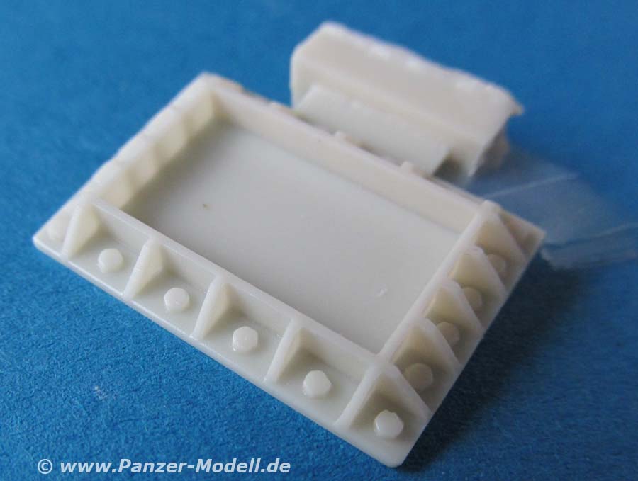 Die recht umfangreichen PE Teile enthalten viele weitere Details, wie unter anderem die Halterungen für die Munition, Kettenbleche, Lüftergitter, Seitenschürzen, usw.. Exzellente Qualität mit fein definierten Details!