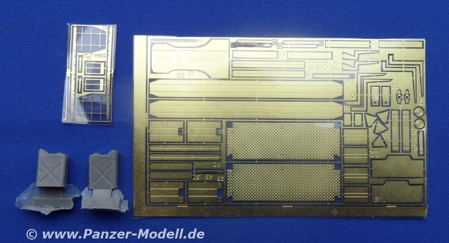 Der kleine Bogen Ätzteile enthält die Schutzbügel der Scheinwerfer (beim Bausatz sehr gut, aber da sieht man wo beim Spritzguss die Grenzen sind).
