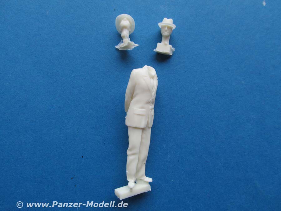 Besonders gut ist, neben der Tatsache, dass Zivilfiguren eine exzellente Bereicherung für Dioramen sind, die Gestaltung und Machart der Köpfe - allein die dünnwandige gestaltung der Hutkrempe ist sensationell. Auch die Gesichter sind sehr gut. Durch die einzeleinpassung der Köpfe auf den Körper kann man als Modellbauer noch ein wenig an Kopfhaltung und Blickrichtung arbeiten, was für einzelne Szenen sicher von Vorteil ist.