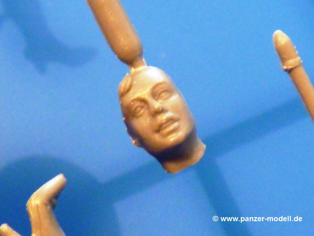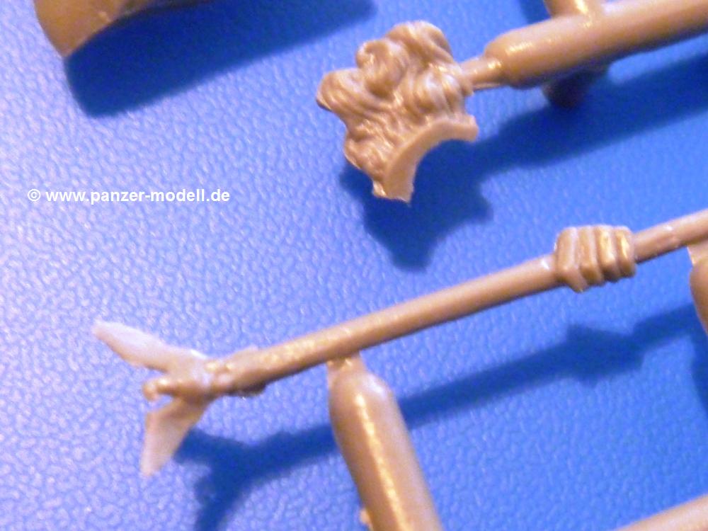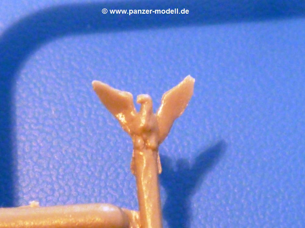 An zusätzlichen Details finden wir z.B. eine Schleife am Oberteil und den Adler auf der Fahnestange. In der Makroansicht mag sein Kopf vielleicht ein wenig unförmig wirken, aber mit blossem Auge ist der Adler schon ganz toll. Bei den wenigen Teilen stellt der Zusammenbau sicherlich keine Probleme dar. Nur bei der Fahne bin ich mir nicht ganz sicher. Erst habe ich sie für ein Trockenreibedecal gehalten, aber scheinbar wird sie einfach nur zurechtgeschnitten, um die Fahnenstange gelegt und zusammengeklebt. Die Anleitung schweigt sich darüber aus.