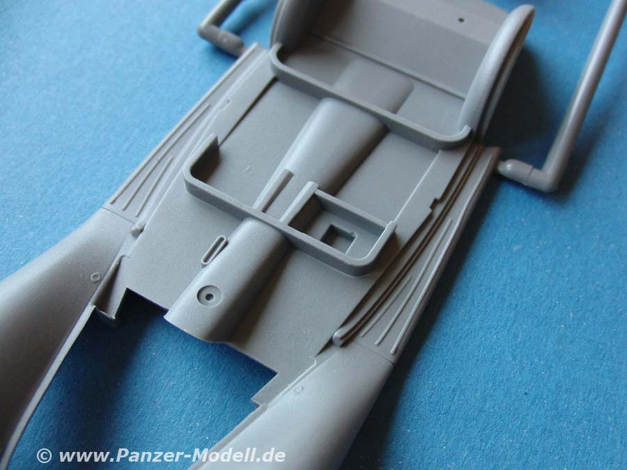Der Innenraum weist alle wichtigen Teile auf, wie Sitze und Sitzbank, Armaturen und Lenkrad. Und natürlich sind klare Plastikteile für Scheinwerfer und Fenster enthalten. Der Wagen lässt sich wahlweise offen oder mit verdeck bauen. Desweiteren weiss der Bausatz mit einem kompletten Motor und einem recht umfangreichen Rahmen und Federung/Lenkung zu gefallen.