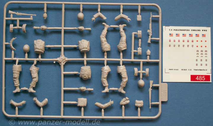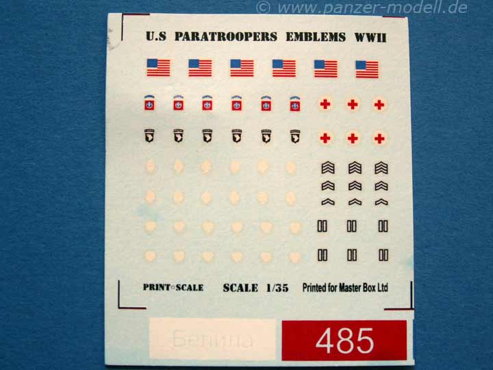 Als Dreingabe gibt es einen Decalbogen mit Abzeichen für die uniformen der Figuren, wie etwa USA Flaggen, Dienstgradabzeichen, Rotkreuzzeichen, usw.