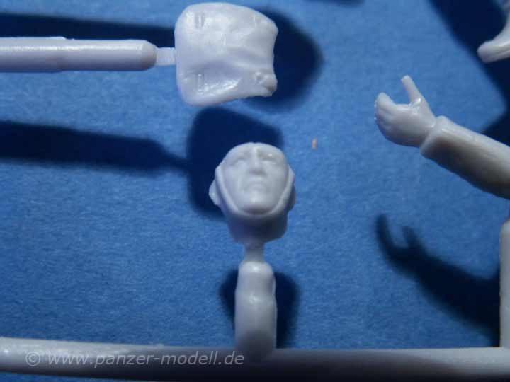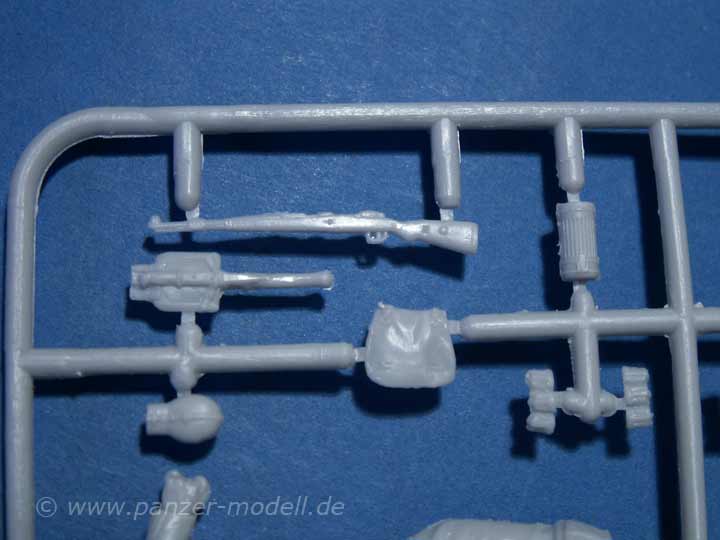 Dieses Set umfasst wieder 4 Figuren aus Plastikspritzguss. Die Qualität ist wie man sie mittlerweile von Masterbox kennt und wie sie in Plastikspritzguss machbar ist. Die Posen der Figuren sind alle stehen, bzw leicht geduckt vorwärts gehend. Natürlich fehlen nicht die typischen Waffen und Zubehör, wie Karabiner, MG, Munitionskasten und persönliche Ausrüstung. Die Qualität der Details ist als wirklich ansprechend zu bezeihnen, gerade das Zubehör weiss zu gefallen. Die Figuren haben eine kleine Naht an den Seiten, die man aber schnell entfernen kann. Die Gesichter sind für Spritzguss echt ordentlich und weisen verschiedene Gesichtsausdrücke auf. Als Kopfbedeckung sind Helme vorgesehen, wobei der Kinnriemen bereits mit am Gesicht angegossen ist.