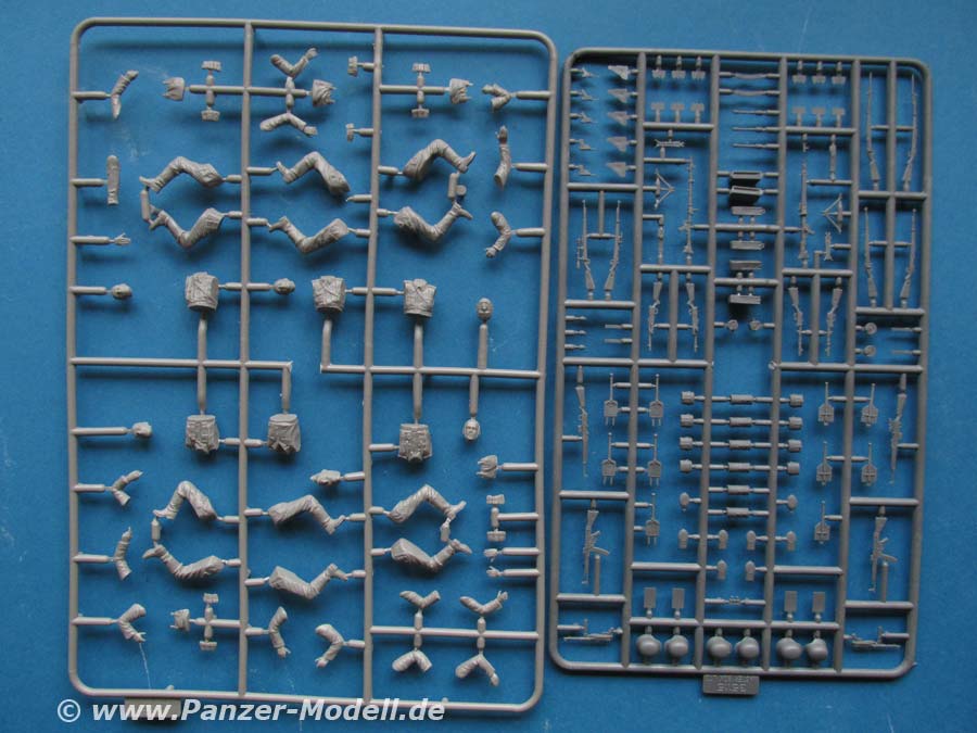 Im Karton finden sich zwei Spritzlinge mit allen Teilen zum Bau von 6 Figuren, die sitzend auf einem LKW oder Halbkettenfahrzeug sind.