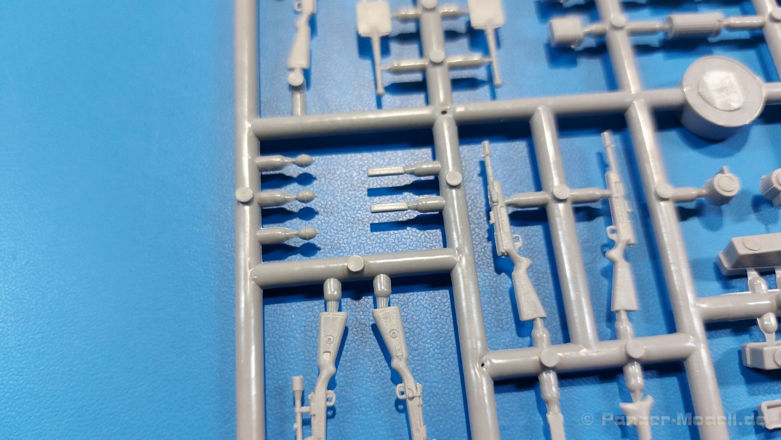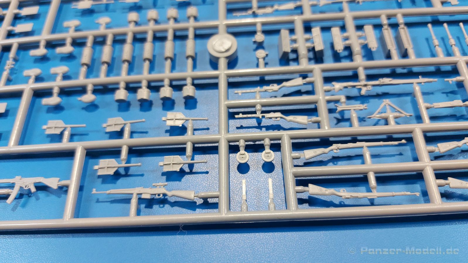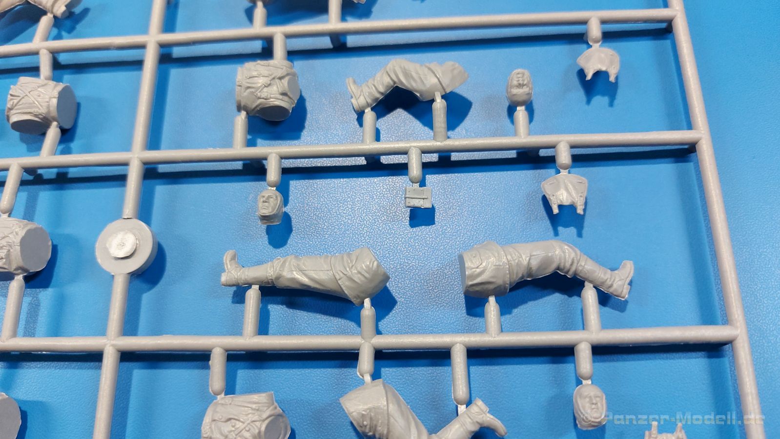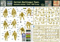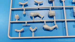 Die ukrainische Master Box Ltd. hat sich sehr stark auf die Produktion von Figuren fokussiert. So haben wir auch heute wieder einen Satz Figuren deutscher Soldaten vor uns. In der 250 x 175 x 35 mm großen Faltschachtel befinden sich zwei hellgraue Spritzlinge, einer mit den Figuren, ein weiterer mit Waffen und Zubehör, der auch separat erhältlich ist unter der Nr. MB35115. Die Qualität der Teile ist wie gewohnt gut mit für Spritzguss guten Details an Uniform und Gesichtern. Die Gesichter sind ausdrucksstark und realistisch modelliert, die Uniformen fein und mit realistischem Faltenwurf gemacht. An manchen Teilen wie zeigt sich eine leichte Trennnaht, die aber recht schnell zu versäubern sein wird. Das Set beinhaltet 5 deutsche Soldaten eines MG-Trupps im Angriff, bzw. teils beim Absitzen z.B. von einem Panzer. Sie tragen teils gefütterte Winteruniformen, Schneehemd oder eine Mischung aus Winterjacke mit normaler Uniformhose. Der MG-Schütze trägt ein MG-34 am geteilten Tragegurt (der aber leider nicht geteilt ist). Zwei Munitionsträger, einer mit zwei Gurtkästen, einer mit einem Gurtkasten, begleiten ihn. Zwei weitere Soldaten, mit Karabiner, bzw. mit MP-40 bewaffnet, sitzen von einem Fahrzeug ab (können aber sicherlich auch noch anderweitig verwendet werden). Standardmäßig sind alle mit Brotbeutel, Feldflasche, Gasmaskenbüchse und Stahlhelm ausgestattet. Anders als auf dem Deckelbild gezeigt, sind alle Helme blank, also ohne Tarnüberzug. Die Karabinerträger haben die entsprechenden Munitionstaschen am Koppel, der MP-Träger die passenden Magazintaschen und der MG-Schütze eine MG-Werkzeugtasche. Letztere zwei bekommen zusätzlich eine Pistolentasche, die anderen drei Klappspaten. Der Waffen- und Zubehörspritzling enthält mehr als man die 5 Figuren braucht. Man findet z.B. weitere MGs (MG-34 und MG-42) mit separatem Verschlußdeckel, aufgespreiztem Zweibein, gefaltetem Zweibein, Gurtabschnitten und Trommelmagazinen, MP-44, MP-40, Bergmann-MP mit passendem Trommelmagazin, Scharfschützenkarabiner mit Zielfernrohr, Karabiner mit aufgepflanztem Bajonett, Stiel- und Eierhandgranaten, Pistolentaschen, 2 Walter und 3 Luger Pistolen. Man kann also die Figuren auch noch etwas nach eigenem Gusto variieren. Auf der Rückseite der Schachtel befindet sich die Spritzlingübersicht mit den Nummern der Teile. An den Spritzlingen selbst befinden sich keine Nummern. Man muss also die Spritzlinge mit der Übersicht vergleichen, um die Teile zu identifizieren. Auch die „Bauanleitung“ ist hier. Sie besteht aus Vorder- und Rückansichten der Figuren mit Nummernangaben, welches Teil wohin gehört. Es werden Farbangaben zur Bemalung mit Vallejo-Farben gemacht, die aber kaum direkten Bezug zu den Figuren nehmen. Für die Uniformen werden zwei Tarnvorschläge gemacht. Die Wintertarnung entnimmt man eher dem Schachtelbild. Ich empfehle bezüglich Bemalung selbst zu recherchieren. Wieder ein schönes Set von Master Box, das alleinstehend schon etwas hermacht, aber auch in Verbindung mit Fahrzeugen großes Potential hat, ein Diorama entsprechend zu beleben. Der Preis auf dem deutschen Markt liegt bei ca. 13,- Euro. Ein Schnäppchen, meine ich da!