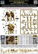 Erneut legt MB eine Reihe von (insgesamt sieben) Figurenbausätzen auf, die das Thema des russischen Angriffskrieges zum Inhalt haben. Traurig ist nur der Anlaß der der Herstellung und Vorlage dieser Figuren dient. Im vorliegenden Karton finden wir einen hellgrauen Spritzling, der zwei Figuren und Zubehör beherbergt. Alle Teile sind sauber gespritzt, ohne Sinkstellen, Versatz oder Fischhäute. Die Figuren bestehen aus mehreren Teilen. Die Posen sind vorgehenderweise sehr dynamisch und interagierend umgesetzt. Die Detaillierung der Figuren ist sehr exzellent für Spritzguss und wird mit einer passenden Bemalung sicherlich zu einem “Schmuckstück”. Hervorzuheben sind hier die durchaus markanten Gesichter.Toll umgesetzt. Auch die Uniformen überzeugen und der Faltenwurf ist nicht übertrieben. Punkten können auch die Waffen und die Schutzwesten. Die Kartonrückseite zeigt den Bau und die Bemalung der Figuren. Eine Farbtabelle mit neun Farben und entsprechenden Farbnummern (Vallejo, Lifecolor, Mr. Color, Tamiya und AMMO by Mig) ist ebenfalls enthalten. Für die Tarnung der Uniformen ist nur ein Vorschlag ohne Farbangaben vorgegeben, bei dem man um eine Recherche also nicht herumkommen dürfte. Ein sehr guter Bausatz zu einem moderaten Preis… Kaufen und bauen oder einfach (schon des Kartonbilds wegen) sammeln… Alle Kits können einzeln oder als Gesamteinheit gebaut werden.
