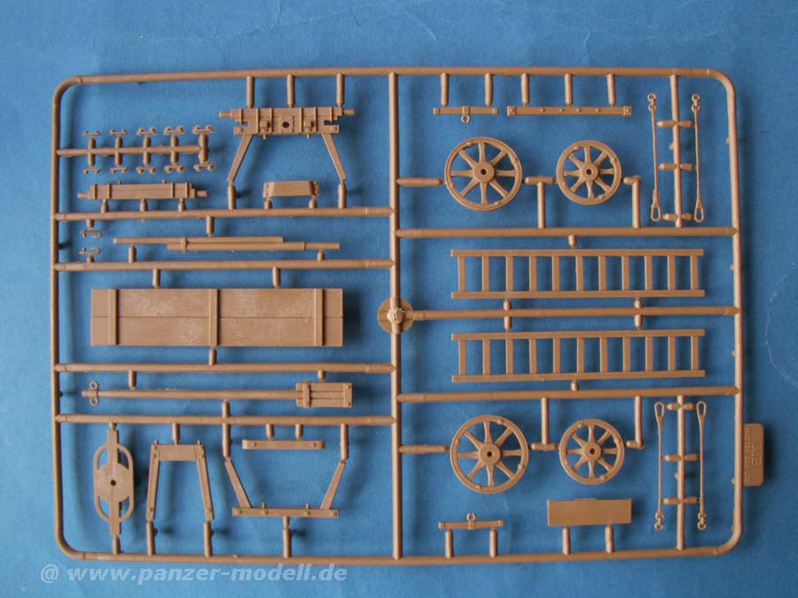 Im Karton findet sich ein Spritzling mit knapp 30 Teilen in Spritzguss. Dieses Set ist in meinen Augen ein Knüller, denn zum einen besticht es durch seine exzellente Teilequalität, zum anderen durch die klasse Auswahl dieses Vehikels. Solch eienn Karren kann man wirklich für sehr viele Dioramen benutzen, sei es verlassen im Feld, im Stall stehend, beladen am Straßenrand, usw. - die Möglichkeiten sind sehr vielfältig.