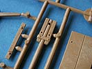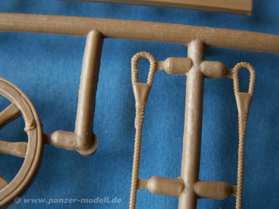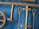 Die Teile sind schön gemacht und mit netten Details - die Räder weisen leichte Holzstruktur auf und besitzen mit Stahlgürtel, welche gut gemacht sind. Die Deichsel mit Anbindung an den Wagen und Vorderachse sowie der Wagen an sich mit den Seitenwänden sind sehr schön gemacht mit leichter Holzstruktur, welche allerdings auch deutlicher hervorgehoben werden könnte.