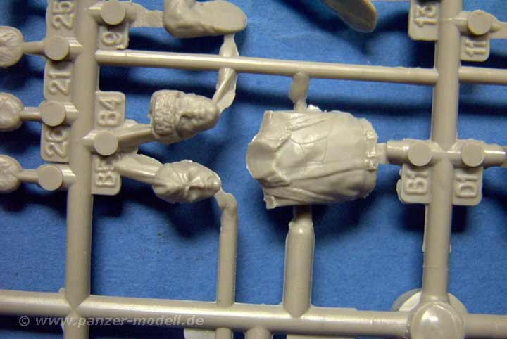 Mit der Nummer 35002 gibt es Nachschub für sovietische Figurenliebhaber, nämlich den Figurenbausatz Soviet Infantry on the march. Dieser umfasst wieder vier Figuren, die diesmal marschieren. Der Clou ist, dass man hier durch die Auswahl verschiedener Körper und Köpfe (mit eben verschiedener Bekleidung und Kopfbedeckungen) 4 Variantionsmöglichkeiten hat. So hat man die "normale" Uniform, aber auch Mäntel, sowie Köpfe mit Schiffchen, Helm oder Fellmütze. Die Qualität ist ganz ansprechend, wenn auch manche Details etwas "soft" erscheinen. Die Ausrüstung der Figuren erstreckt sich über Bewaffnung (u.a. Panzerbüchse, Gewehre, etc), Minen, Klappspaten, persönliche Ausrüstung, sowie Taschen und Säcke.