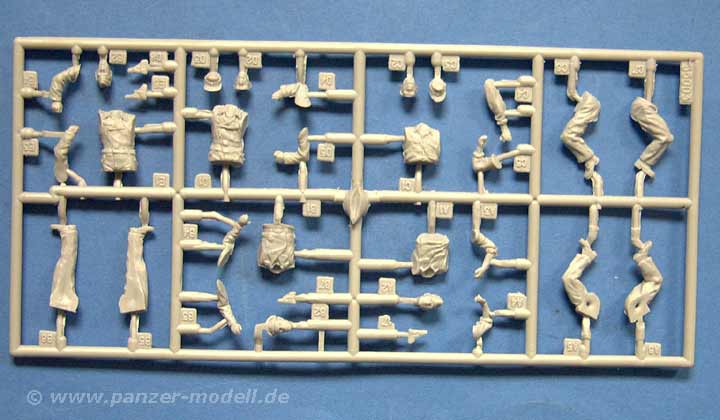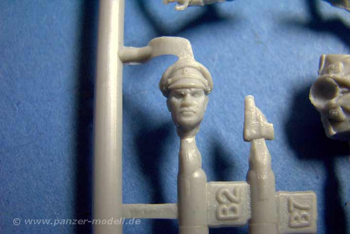 Hier findet sich eine "normale" Panzerbesatzung wie man sie für Panzer III und IV findet mit Kommandant, Richt- und Ladeschütze, sowie Funker und Fahrer. Drei der fünf Figuren sind als Halbfiguren ausgelegt. Die Posen sind recht gut gewählt und lassen sich auch für andere Panzer/Plätze einsetzen. Die Uniform stellt die "normale" schwarze Panzeruniform dar, als Kopfbedeckungen stehen Schirmmütze für den kommandanten, Schiffchen und Einheitsfeldmütze zur Verfügung. An Ausrüstung ist hier nicht viel dabei, ausser Pistolen im Halfter.