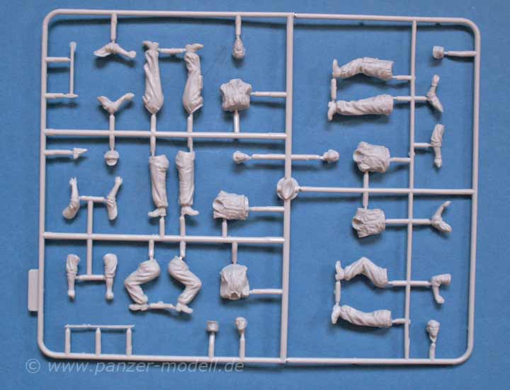 Für Dioramenbauer oder für kleine Szenen in 1/35 ist dieses Set ideal geeignet. In der Schachtel finden sich Teile für 5 Komplettfiguren in Spritzguss. Die Qualität ist dabei recht gut und auch mit feinen Details. Zwar hat man nicht die Qualität von Dragonfiguren oder Resinfiguren, wie von Alpine, aber angesichts des günstigen Preises gut gelungen.