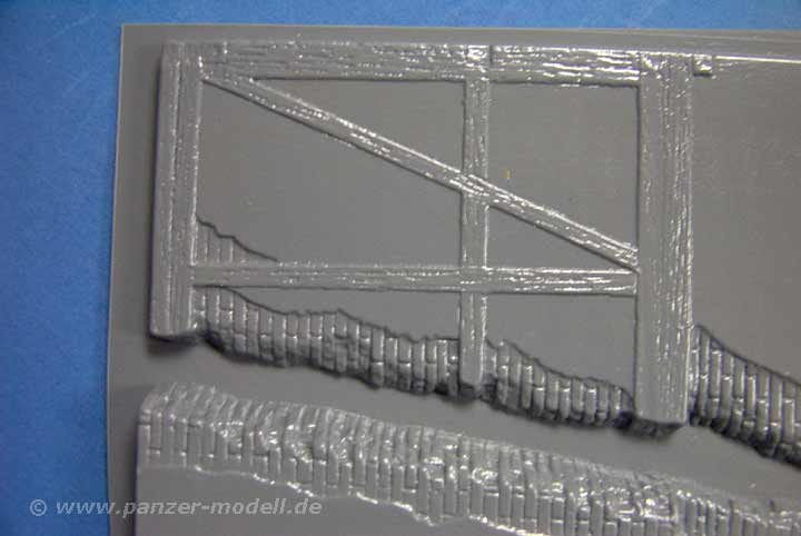 Die Fenster und Türen, sowie Laternen sind aus den bekannten Spritzgussteilen, die dem Bausatz beiliegen.